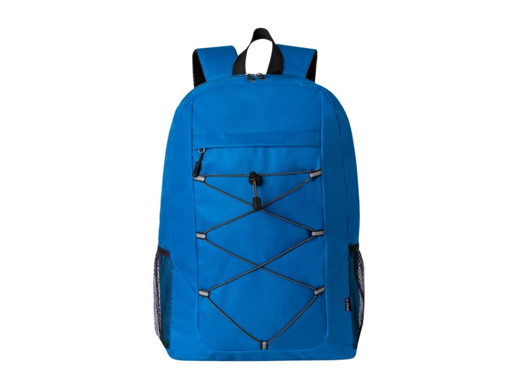 Batoh RPET s priehradkou na zips a predným vreckom, bočné sieťované vrecká, polstrovaný chrbát a ramenné popruhy. 600D RPET polyester s výrazným štítkom RPET.