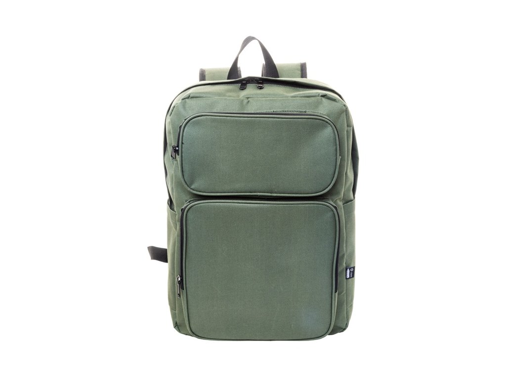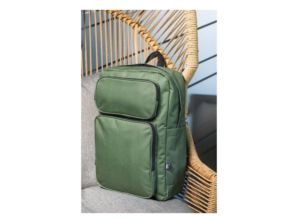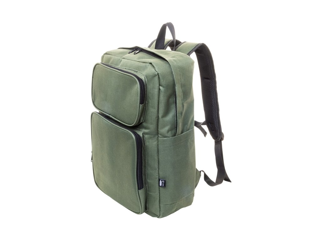 Batoh RPET s hlavným oddielom na zips, 2 prednými vreckami na zips, bočnými vreckami a polstrovanou priehradkou na notebook (15") a tabliet (10") S polstrovaným chrbtom a ramennými popruhmi. Polyester 600D RPET, s výrazným štítkom RPET.