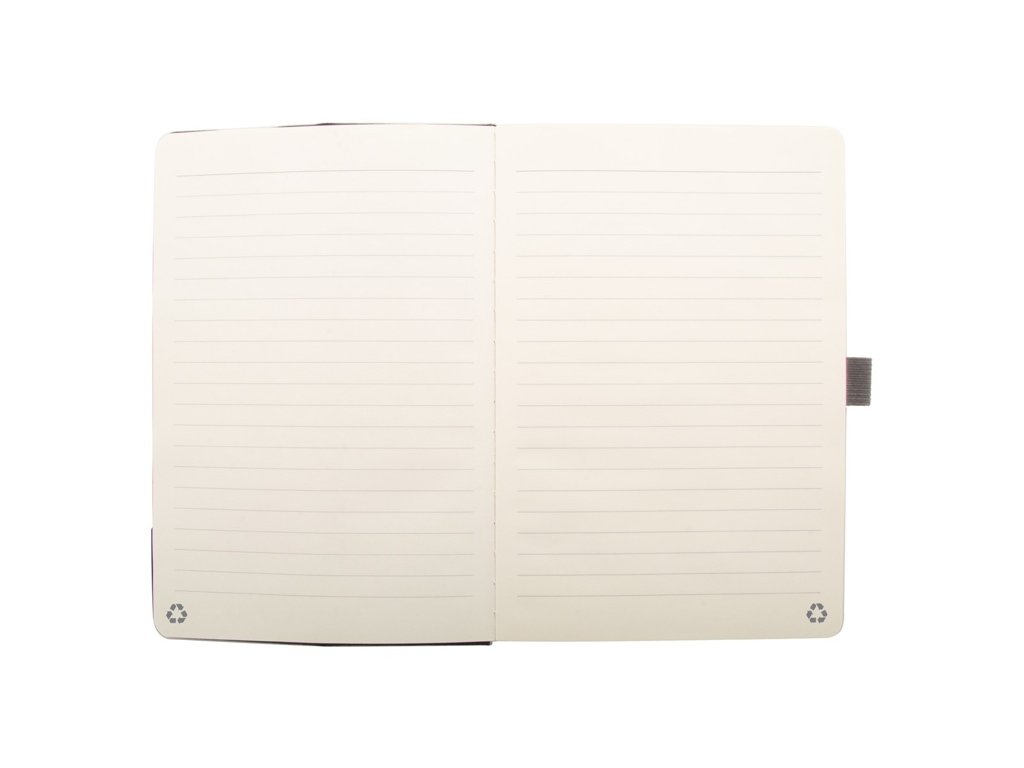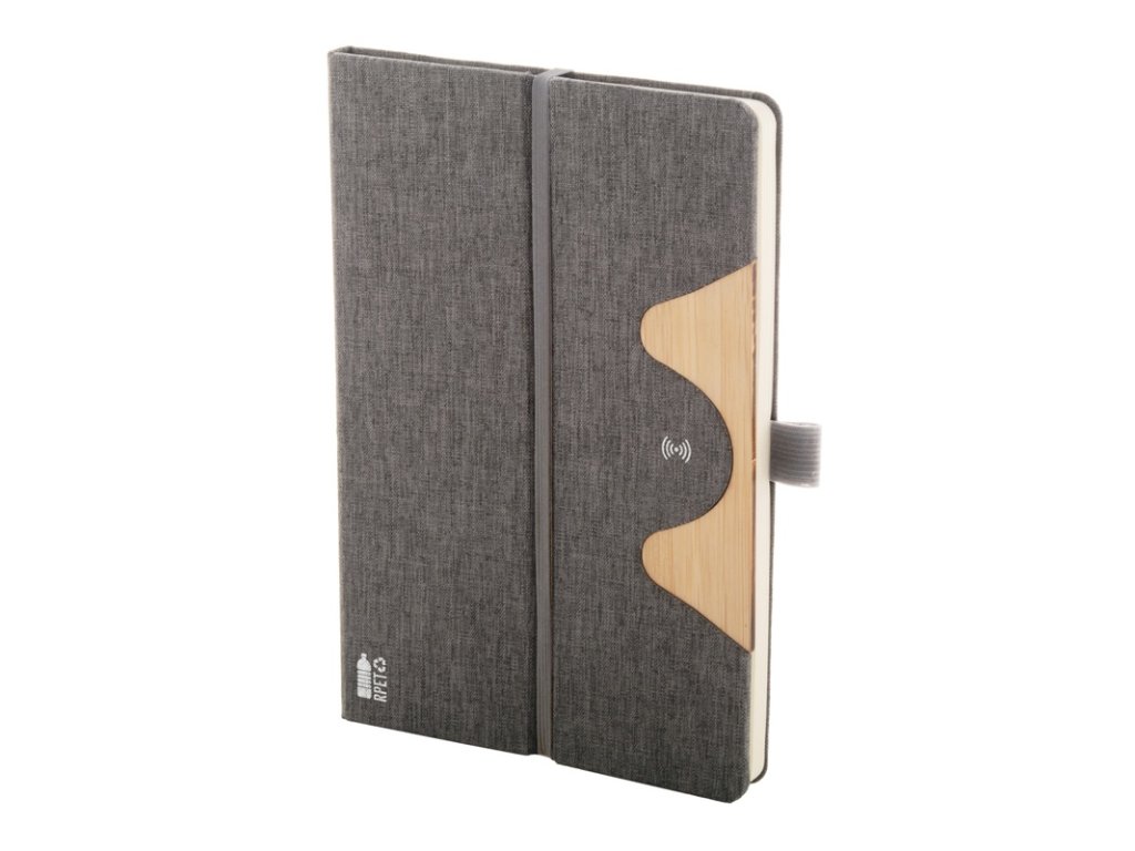 Blok A5 potiahnutý polyesterom RPET s bambusovou vložkou, funkciou stojančeka na mobil a vstavanou bezdrôtovou rýchlonabíjačkou (15W). S 80 linajkovými listami z recyklovaného papiera. Vrátane USB nabíjacieho kábla.