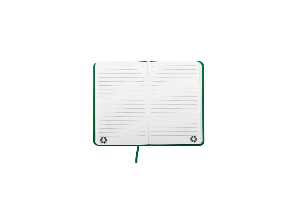Blok potiahnutý recyklovanou PU kožou so 100 linkovanými listami z recyklovaného papiera. So záložkou v zodpovedajúcej farbe a gumičkou. Veľkosť A6.
