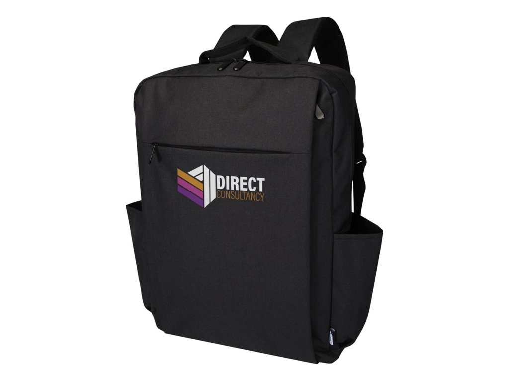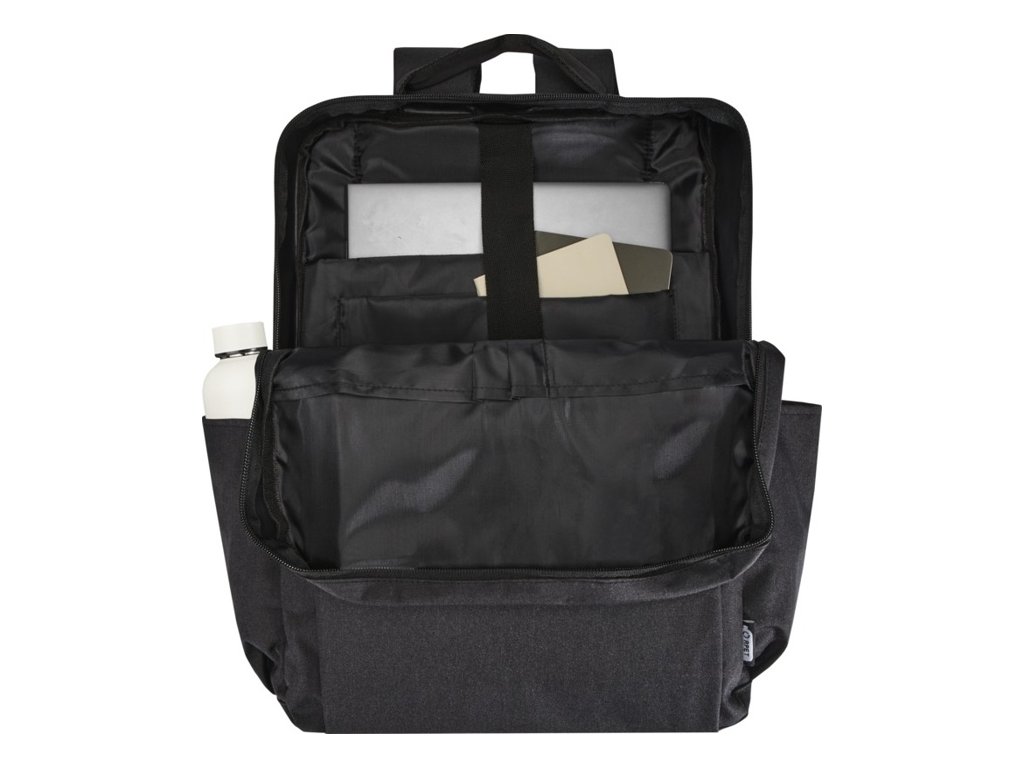 Batoh Libra z RPET s certifikáciou GRS a RPET podšívky a obsahuje 15" priehradku na notebook, polstrované vrecko na tablet, organizačné vrecká, vrecká na vonkajšej strane, polstrované a nastaviteľné ramenné popruhy a popruh na kufor.