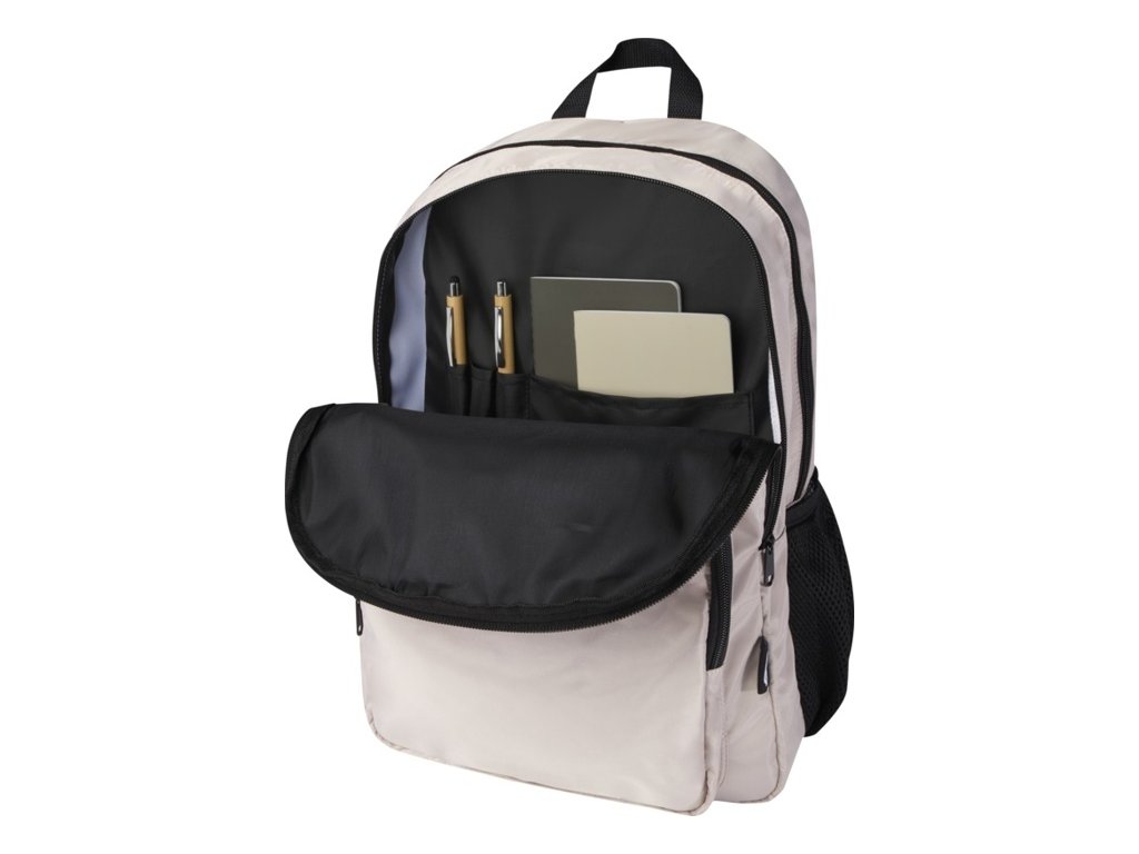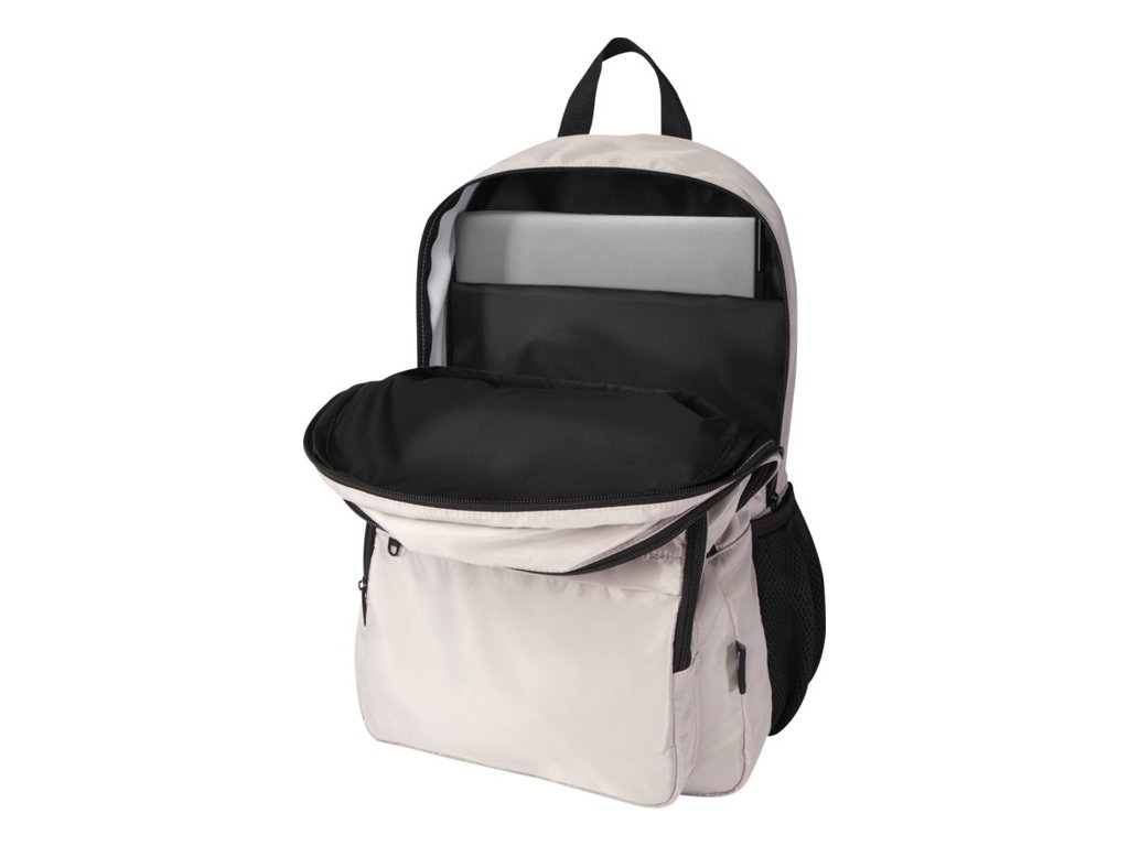 Batoh Trend Plus z recyklovanej mäkkej a nekrčivej tkaniny s certifikáciou GRS s RPET podšívkou. Priehradka na 15 "notebook, organizačná priehradka, predné vrecká na zips, bočné elastické vrecká, popruh na kufor, nastaviteľné ramenné popruhy. Objem: 20 l