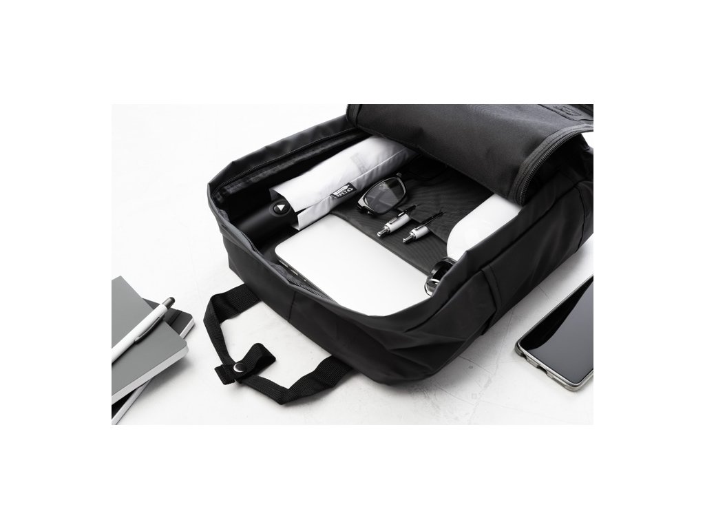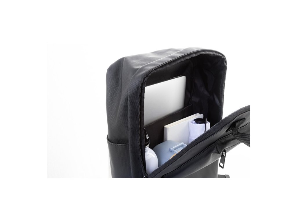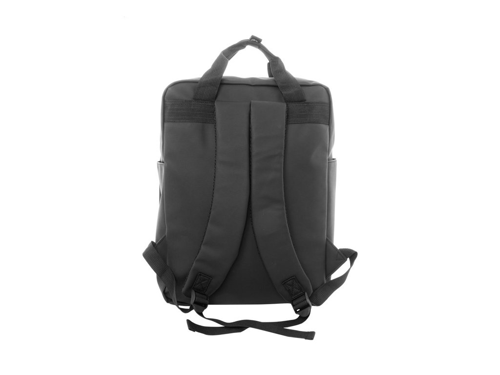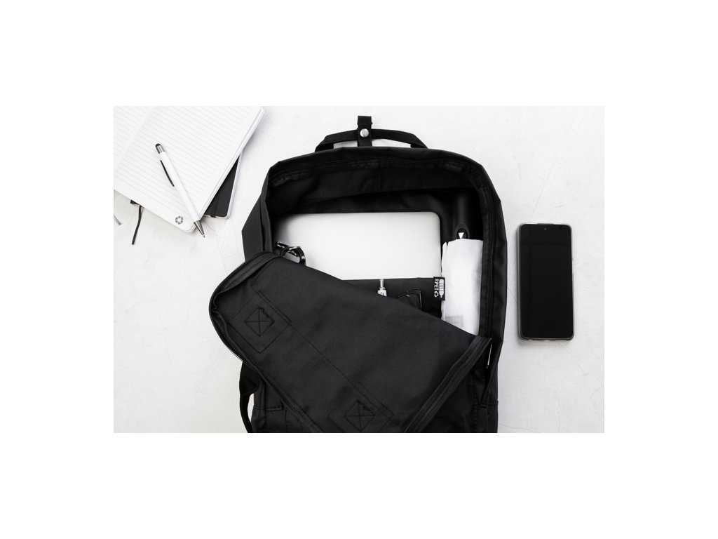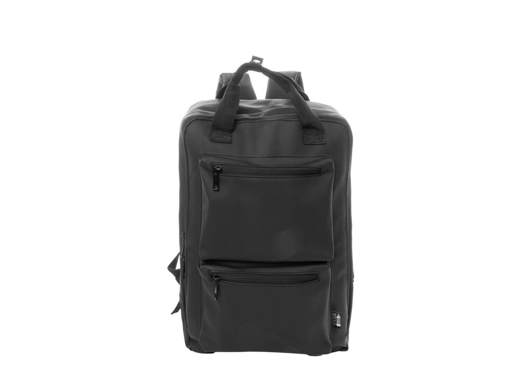 Vodotesný, mäkký batoh z recyklovanej PU kože s hlavným oddielom na zips, 2 prednými vreckami na zips, bočnými vreckami a polstrovanou priehradkou na notebook (15") a tablet (10") S polstrovaným chrbtom a popruhmi. S výrazným recyklovaným PU štítkom.