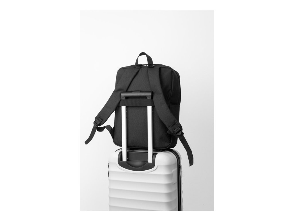 Batoh RPET s hlavným oddielom na zips, 2 vreckami na zips, bočným vreckom a polstrovanou priehradkou na notebook (15"). S popruhom na vozík, polstrovaným chrbtom a ramennými popruhmi. Polyester 600D RPET, s výrazným štítkom RPET.