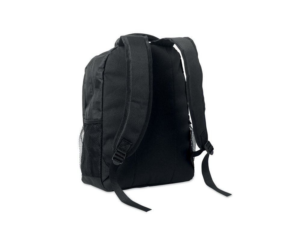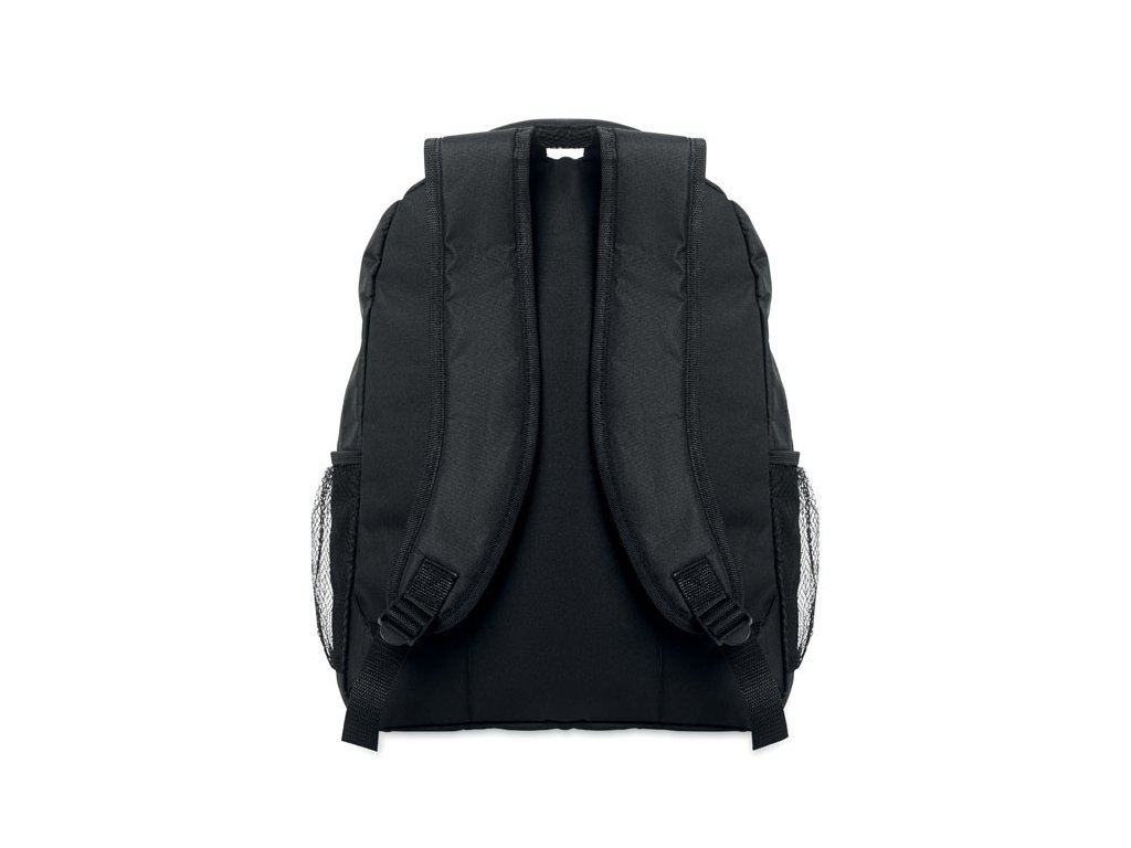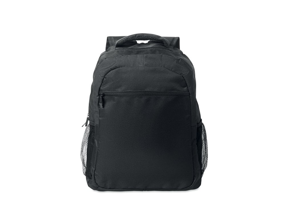 Batoh na 15-palcový notebook z 600D RPET polyesteru s vystuženou priehradkou na laptop vo vnútri, sieťovanými vreckami na oboch stranách a predným vreckom na zips.