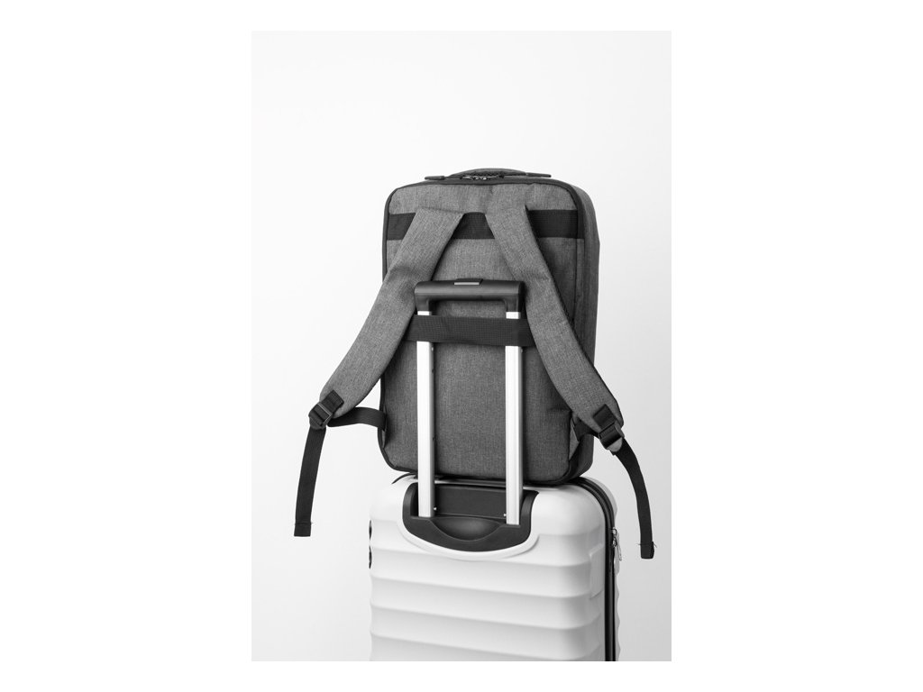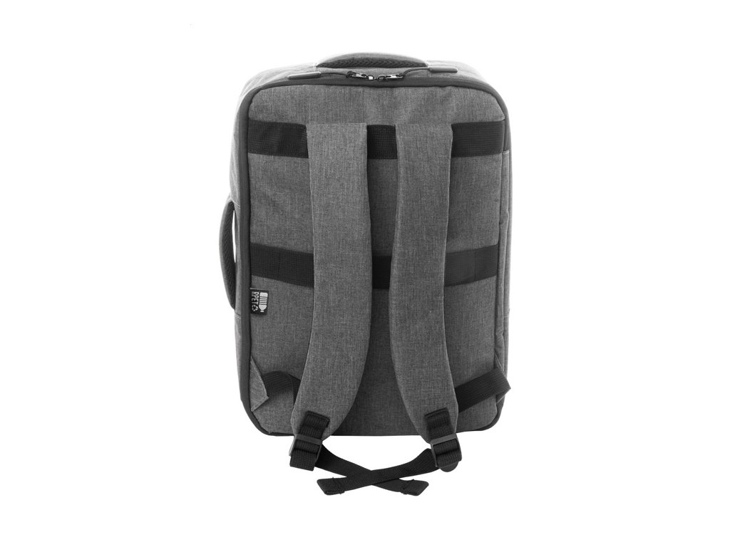 Dvojfunkčný RPET batoh a taška na dokumenty s priehradkou na zips a polstrovanou priehradkou na notebook (15"). S popruhom na vozík, polstrovaným chrbtom a ramennými popruhmi. Polyester 300D RPET, s výrazným štítkom RPET.