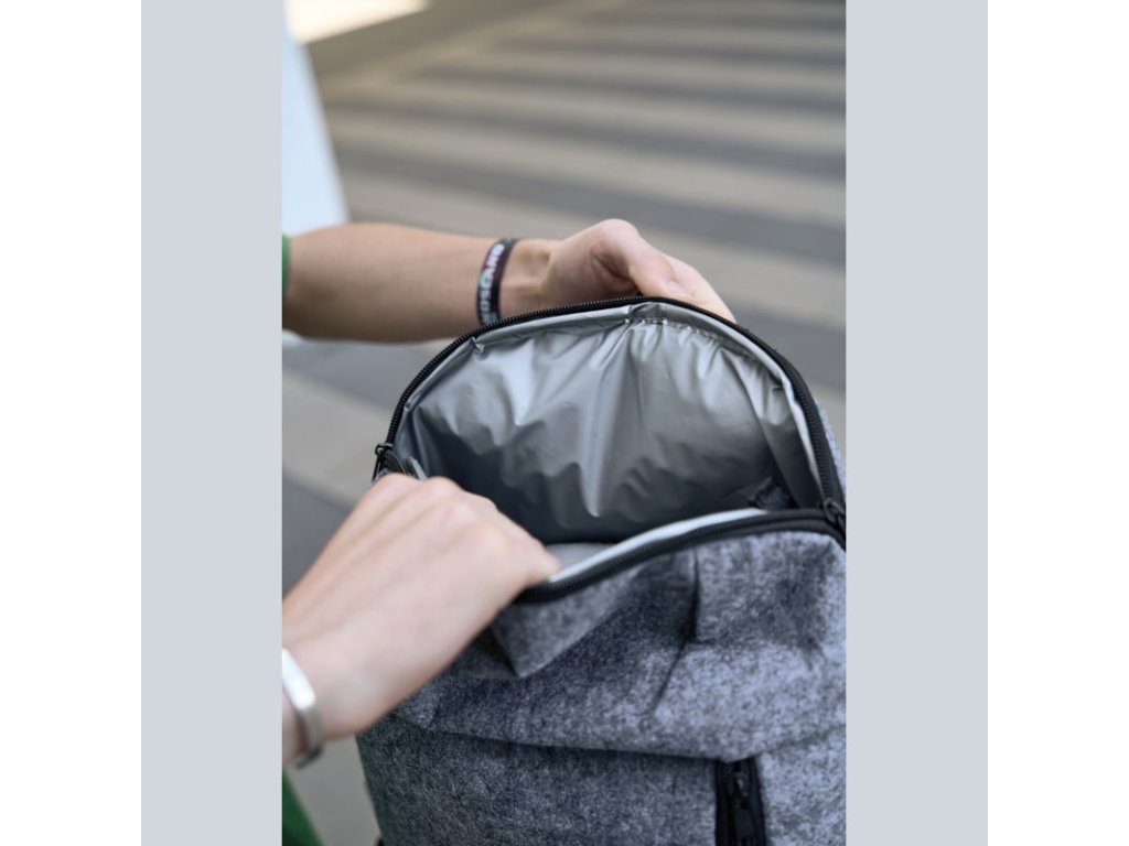 Ruksak vyrobený z RPET plsti s chladiacou funkciou a dodatočnou prednou priehradkou. Udržateľne vyrobený z recyklovaného materiálu.