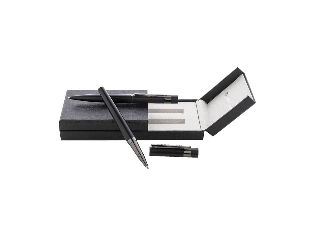 Elegantná sada kovového guľôčkového pera a rollera s lesklými detailmi vo farbe antracit. Vo farebne zladenej darčekovej krabičke a s modrou náplňou. Produkt značky André Philippe.