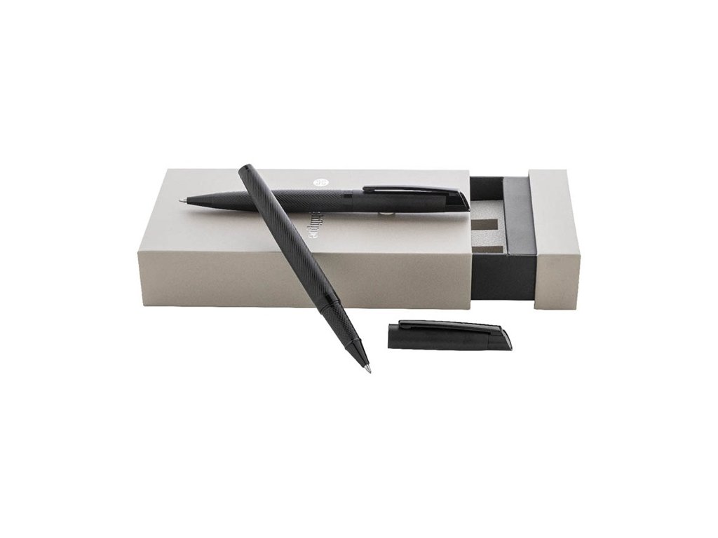 Elegantná sada kovového guľôčkového pera a rollera s diagonálne textúrovaným telom. V dvojfarebnej darčekovej krabičke s modrou náplňou. Produkt značky André Philippe.