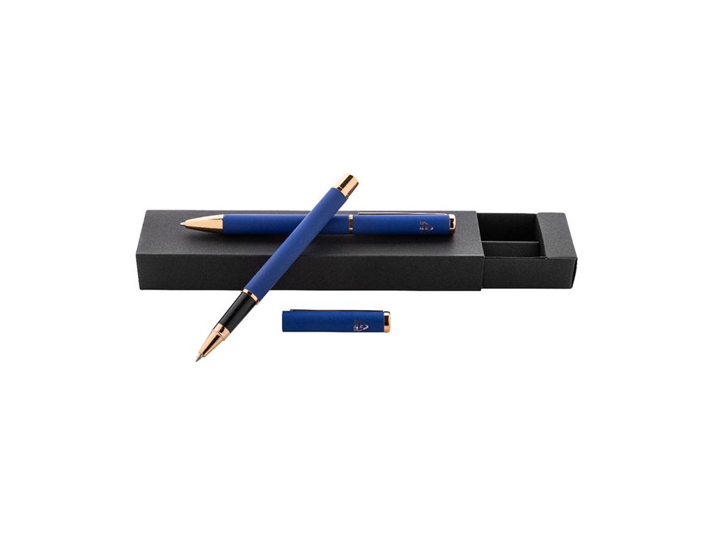 Súprava pier z recyklovaného hliníka s guľôčkovým perom a rollerom s pogumovaným povrchom a detailmi ružového zlata. So modrou náplňou.