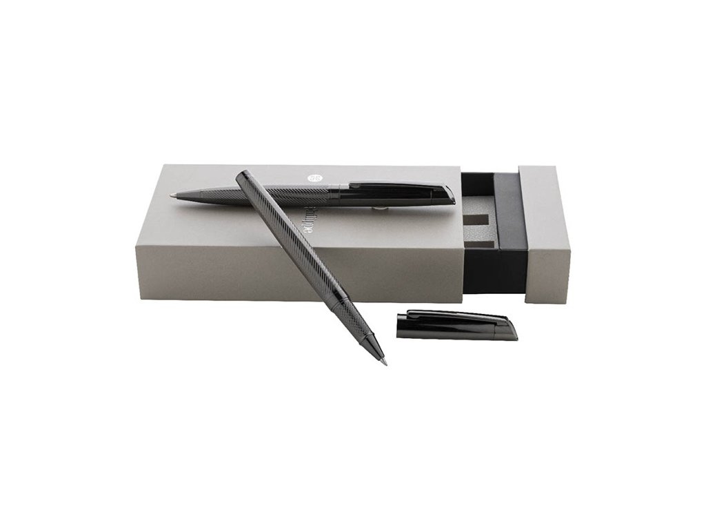 Elegantná sada kovového guľôčkového pera a rollera s diagonálne textúrovaným telom. V dvojfarebnej darčekovej krabičke s modrou náplňou. Produkt značky André Philippe.