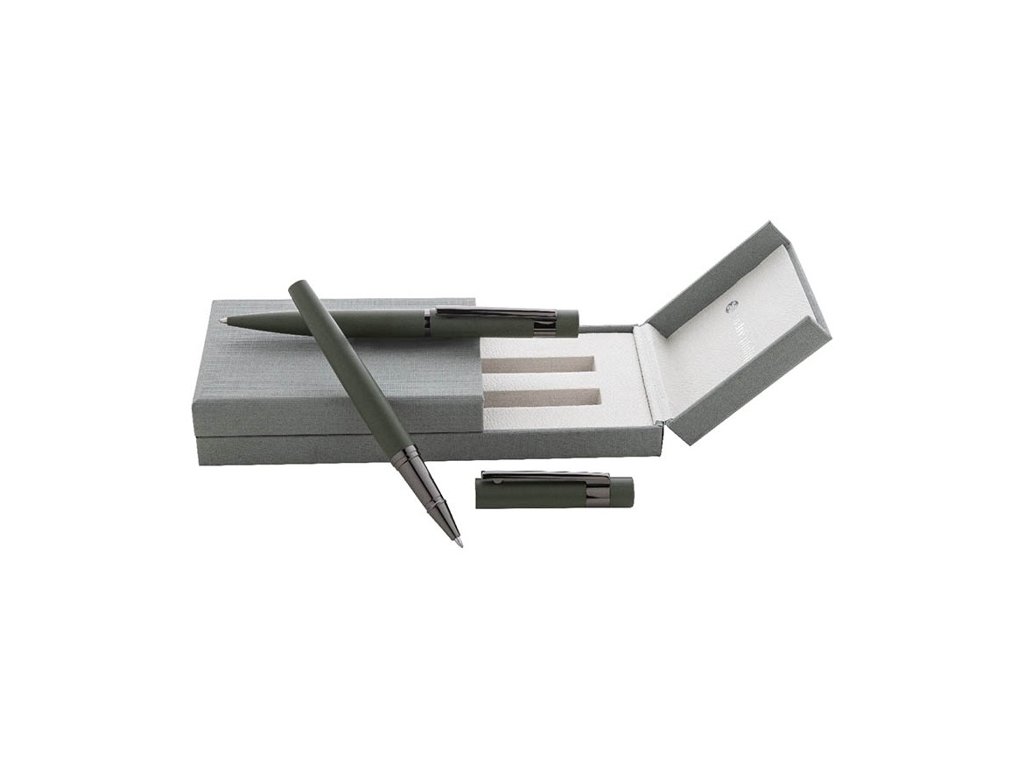 Elegantná sada kovového guľôčkového pera a rollera s lesklými detailmi vo farbe antracit. Vo farebne zladenej darčekovej krabičke a s modrou náplňou. Produkt značky André Philippe.