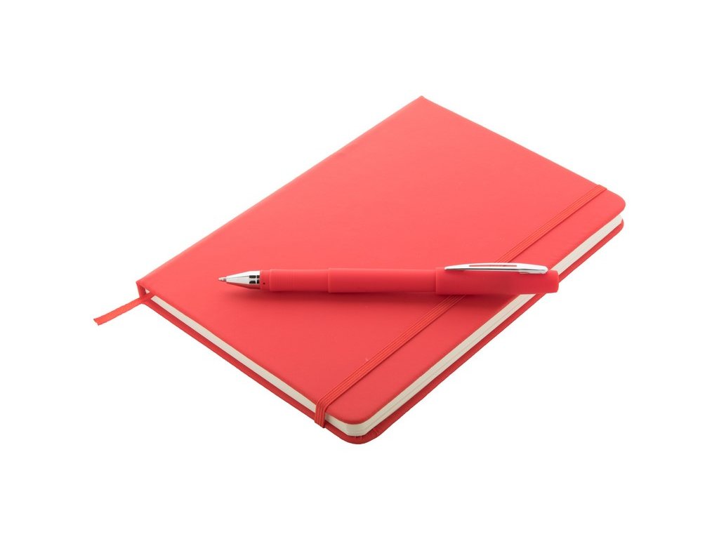 Sada s blokom s doskami z PU kože so 100 čistými listami a rovnako farebným plastovým guličkovým perom s modrou náplňou, v bielej darčekovej krabičke.