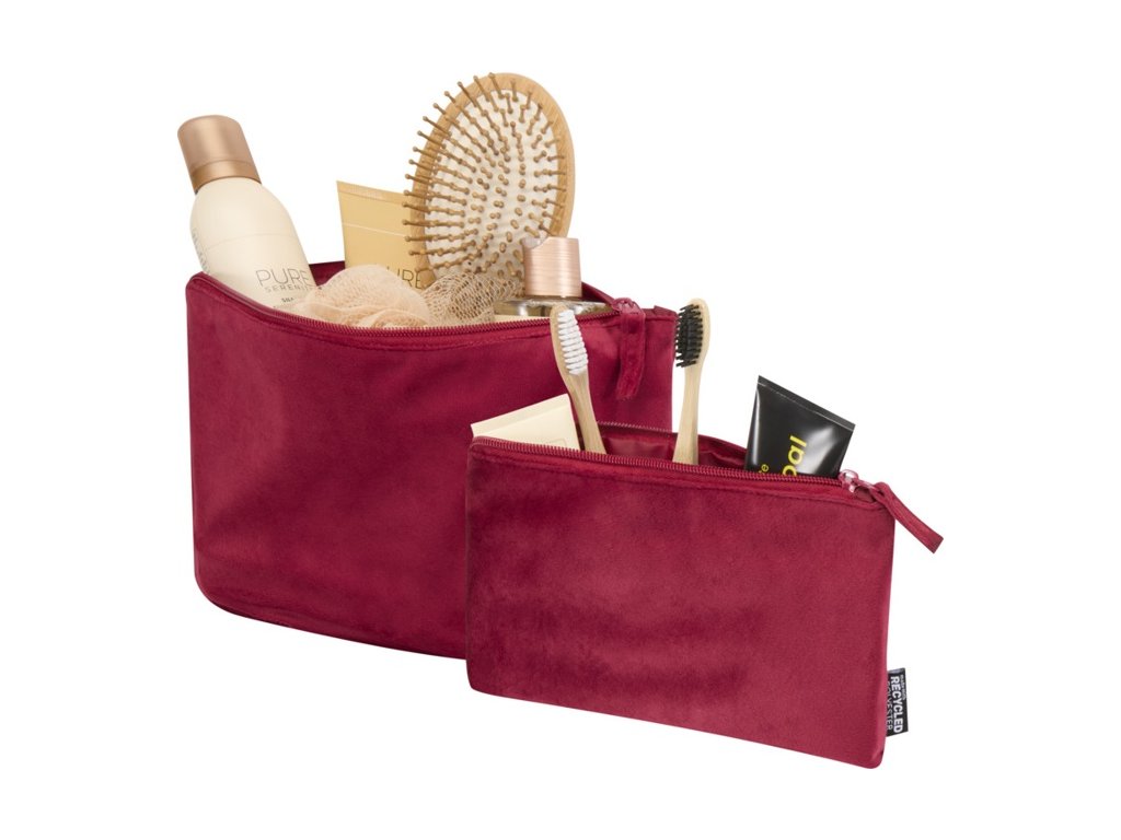 Súprava 2 toaletných taštičiek vyrobených z recyklovaného zamatového polyesteru s certifikáciou GRS. Sada obsahuje jednu veľkú a jednu malú tašku na prehľadné uloženie vecí. Veľká taška má rozmery 32 × 21 cm, malý 23 × 13 cm.