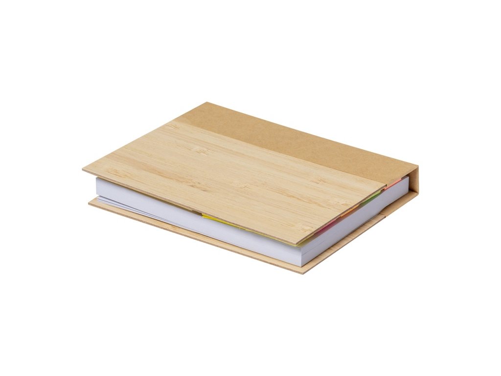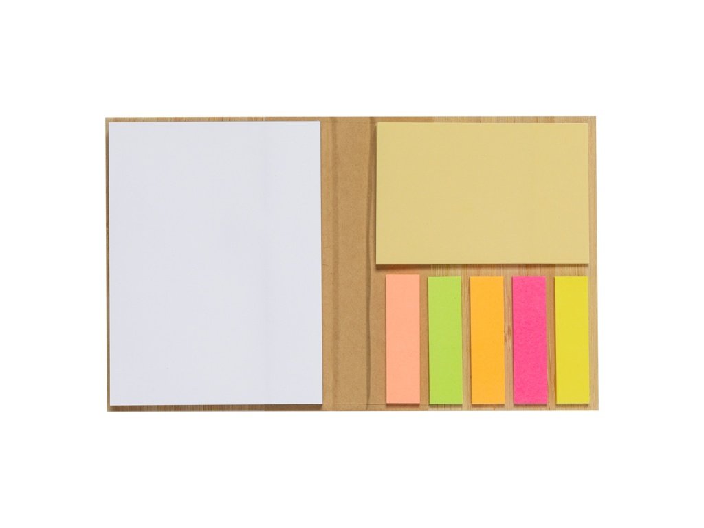 Poznámkový blok potiahnutý bambusom so 70 listami, 25 lepiacimi papierikmi a 125 popisovačmi stránok (v 5 rôznych farbách).