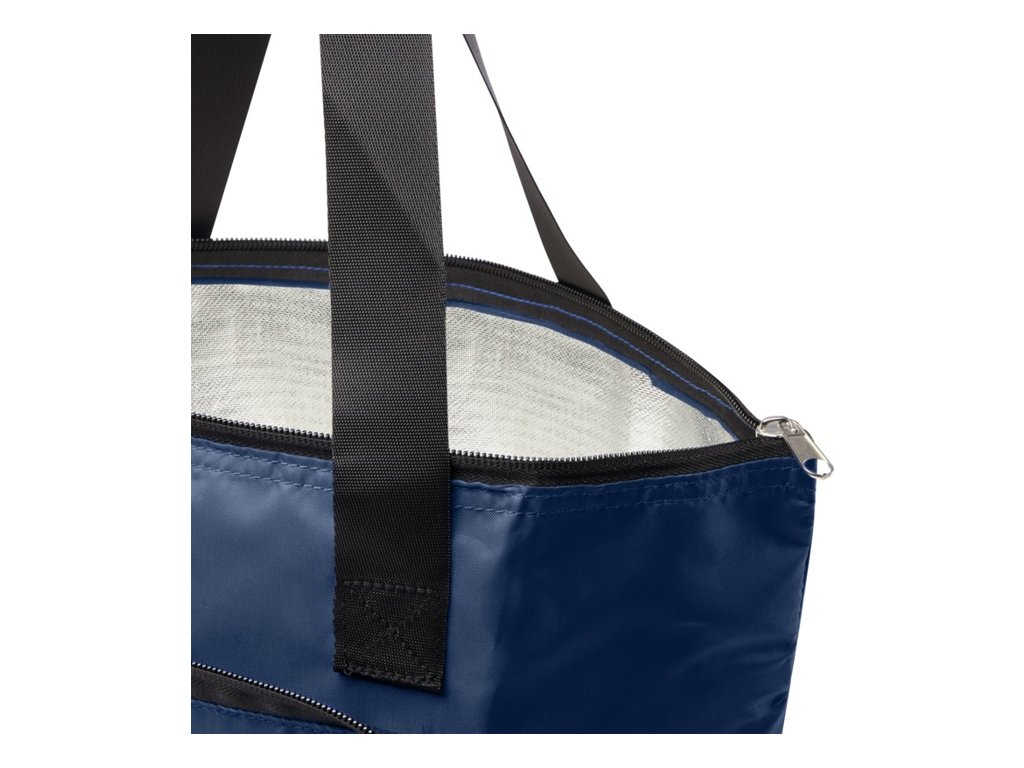 Túto odolnú chladiacu tašku je možné zložiť do kompaktného puzdra s pútkom. Má hlavnú priehradku na zips s hliníkovou fóliou, predné otvorené vrecko a dlhé uši z kvalitného hladkého popruhového materiálu.Vyrobené z RPET bez obsahu PVC. Objem: 15 litrov.