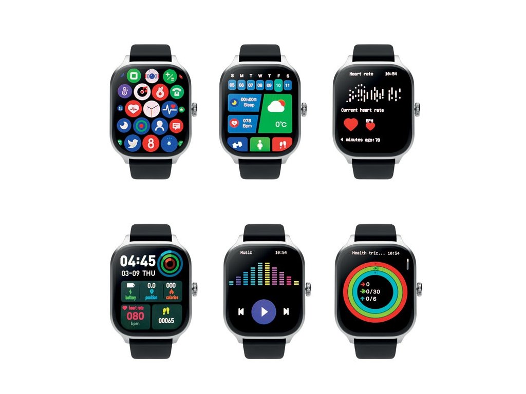 Bezdrôtové inteligentné zdravotné hodinky 4.0 zo zinkovej zliatiny so silikónovým remienkom. 2,01 palcový dotykový LCD displej. Dobíjacia Li-Pol batéria 90 mAh. Vyžaduje bezplatnú aplikáciu (HryFine je k dispozícii pre iOS aj Android).