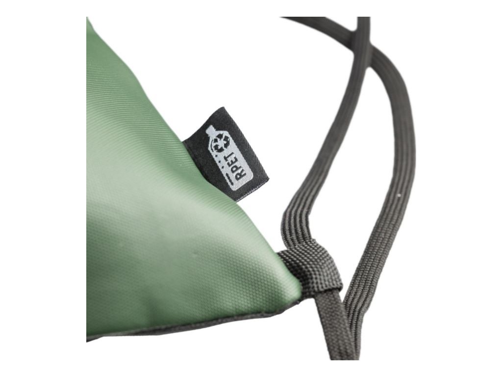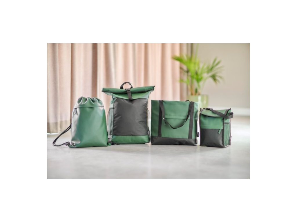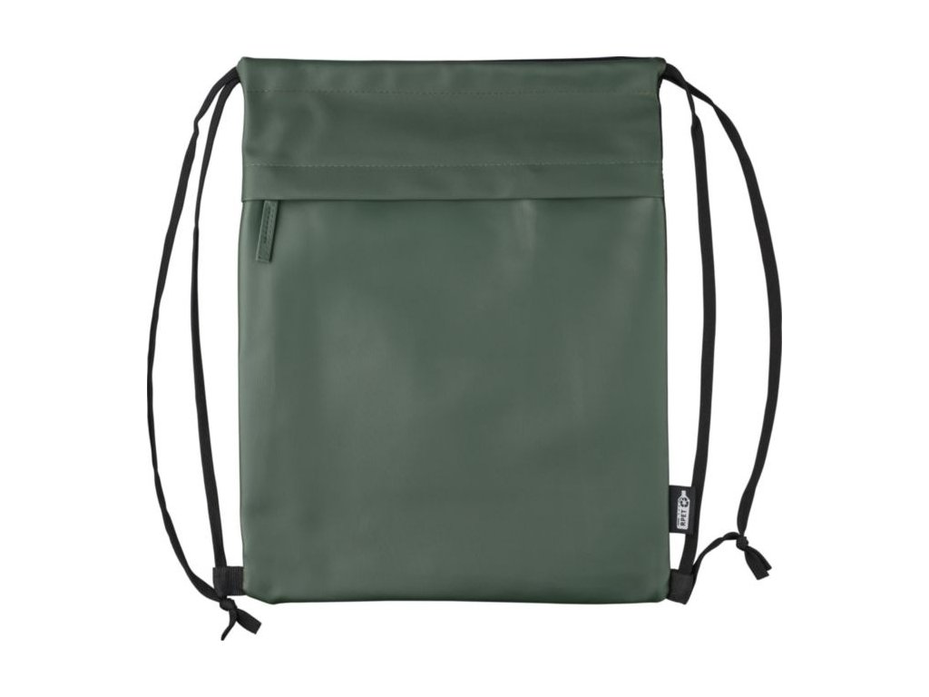 Polyesterové vrecko z rPET (600D) s vodeodolným PU záterom. Skryté predné vrecko na zips a priestranná priehradka so sťahovacou šnúrkou. Obsahuje 2 priehradky s predným a vnútorným vreckom. Objem 8 l, nosnosť 8 kg. Vrátane štítku rPET na vonkajšej strane.