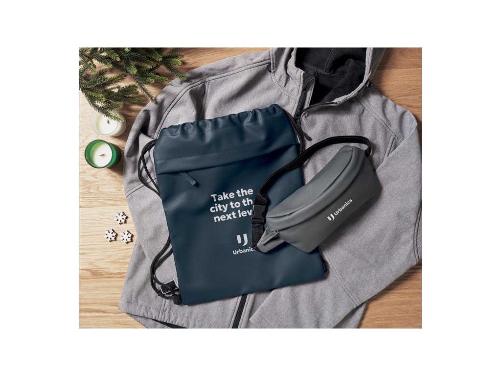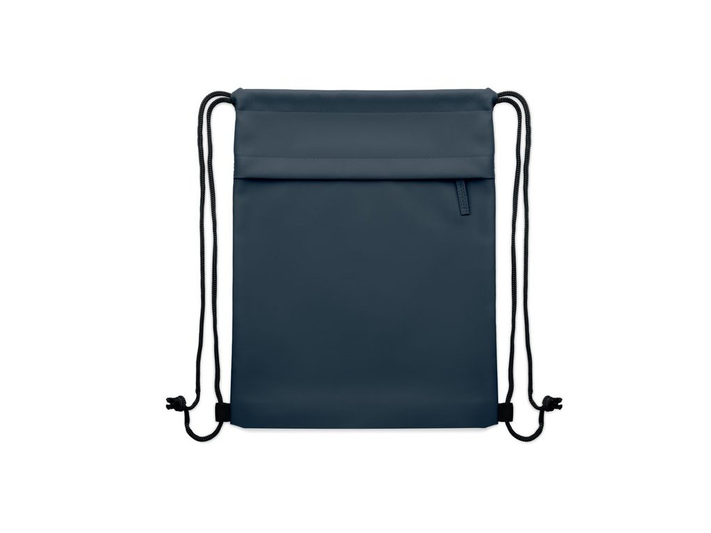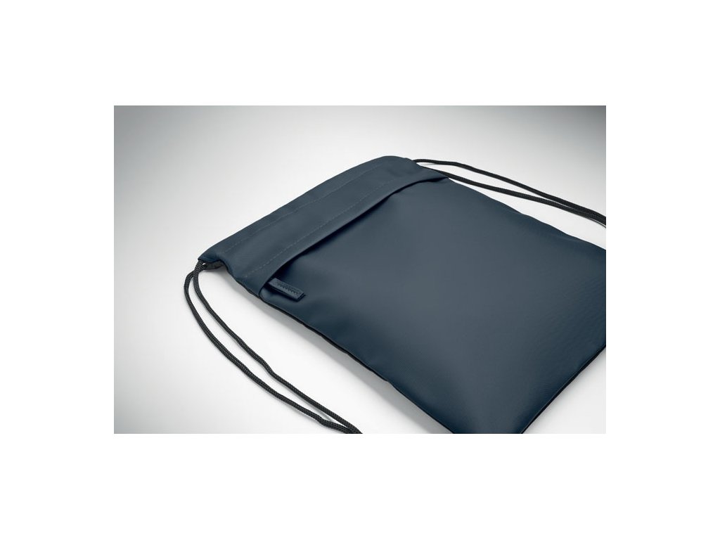 Taška so sťahovacou šnúrkou s PU záterom z polyesteru 600D RPET a podšívkou z polyesteru 190T RPET. Predné vrecko na zips.