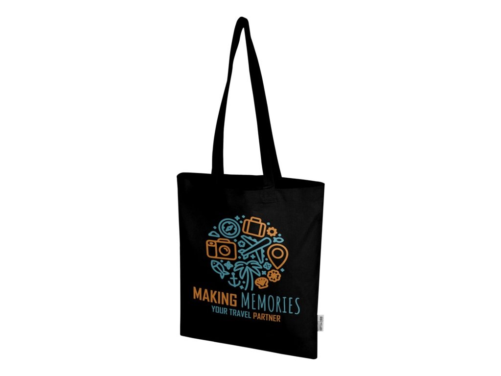 Nákupná taška zo 60% z recyklovanej bavlny GRS a zo 40% z GRS RPET. Vďaka hustote bavlny 140 g/m2 je taška pevná s má dlhú životnosť . Vďaka 30cm uchom cez rameno sa táto taška dobre nosí. Vyrobené v Indii. Nosnosť do 5 kg. Objem: 7 litrov.