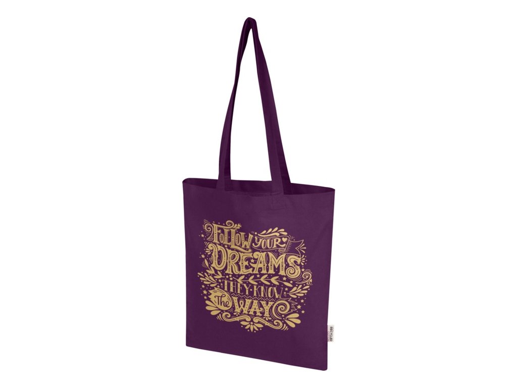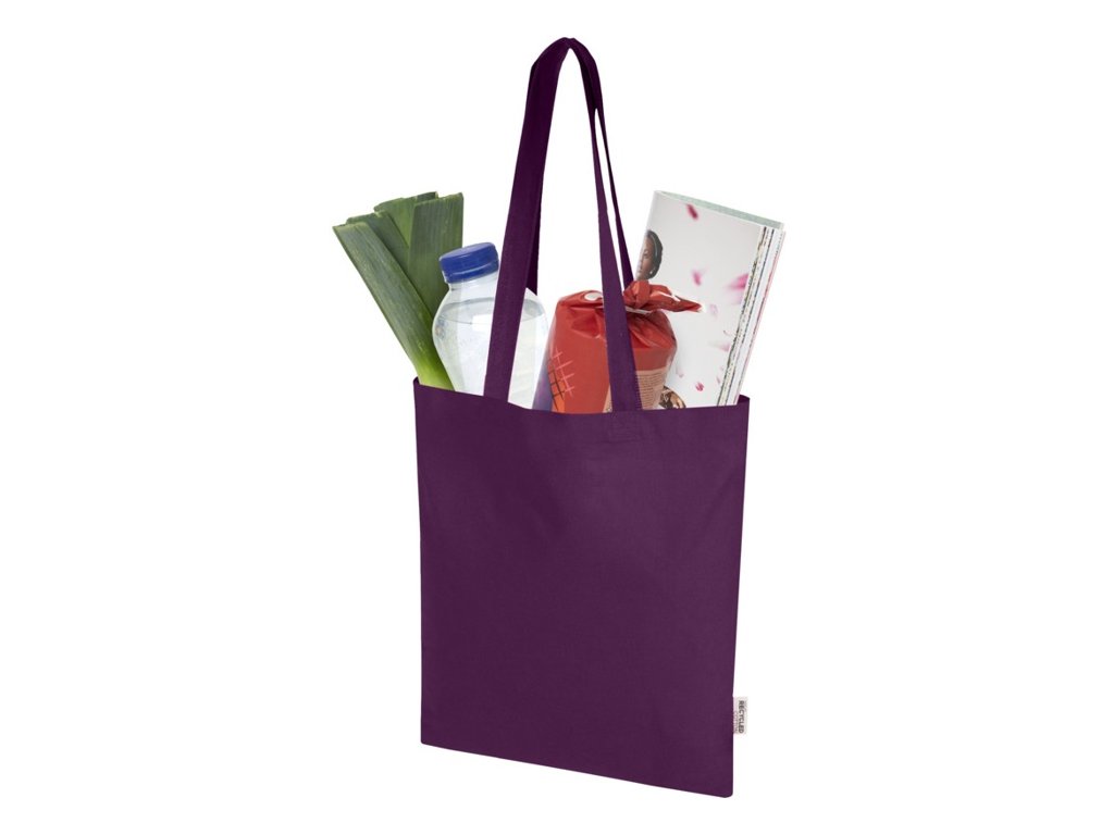 Nákupná taška zo 60% z recyklovanej bavlny GRS a zo 40% z GRS RPET. Vďaka hustote bavlny 140 g/m2 je taška pevná s má dlhú životnosť . Vďaka 30cm uchom cez rameno sa táto taška dobre nosí. Vyrobené v Indii. Nosnosť do 5 kg. Objem: 7 litrov.