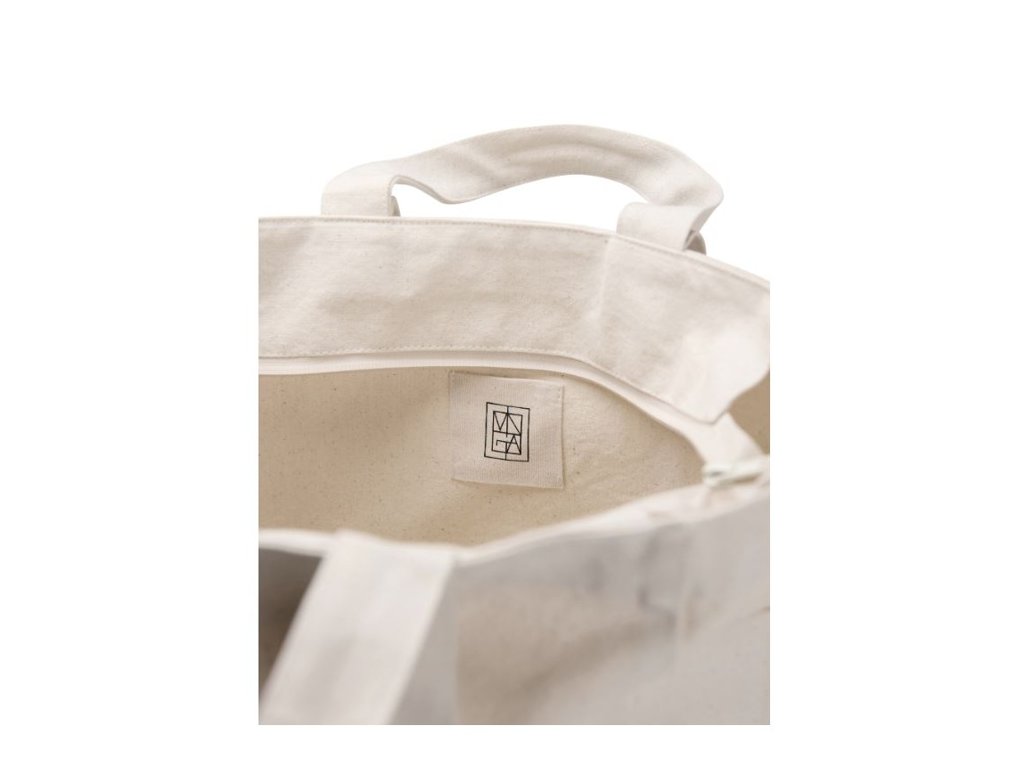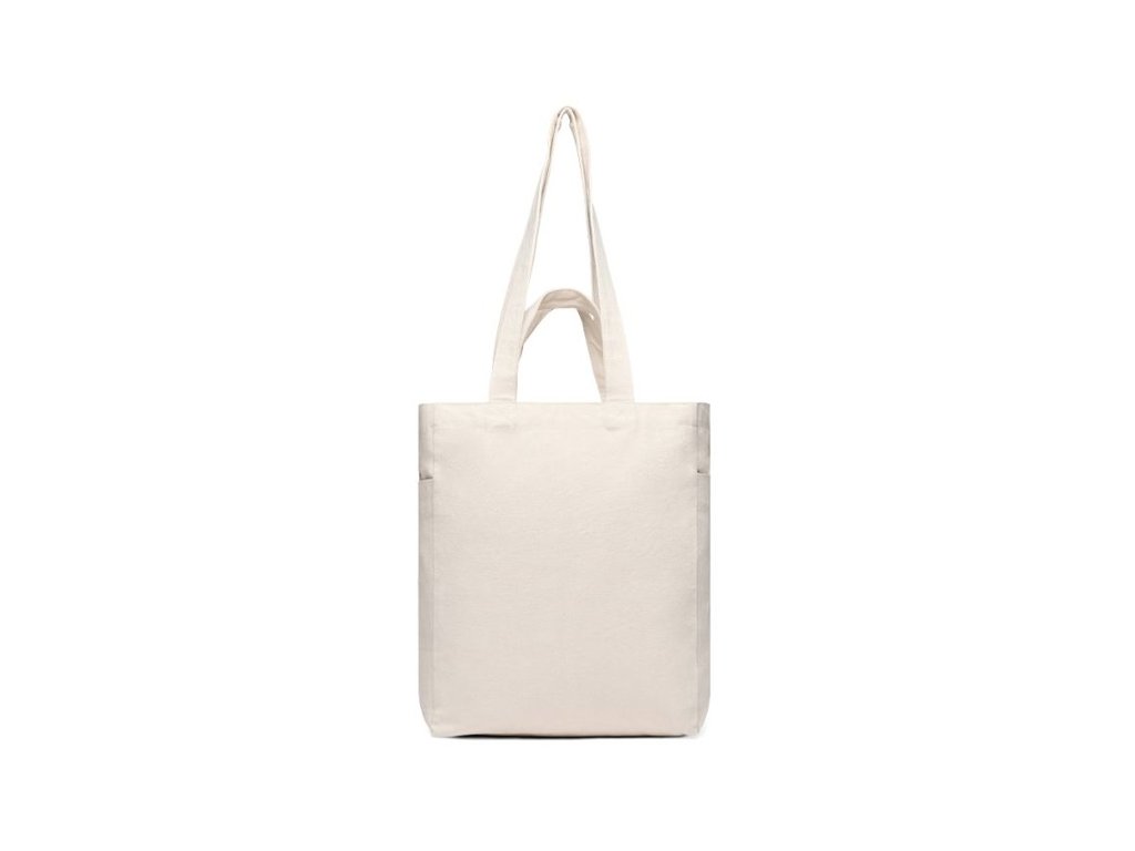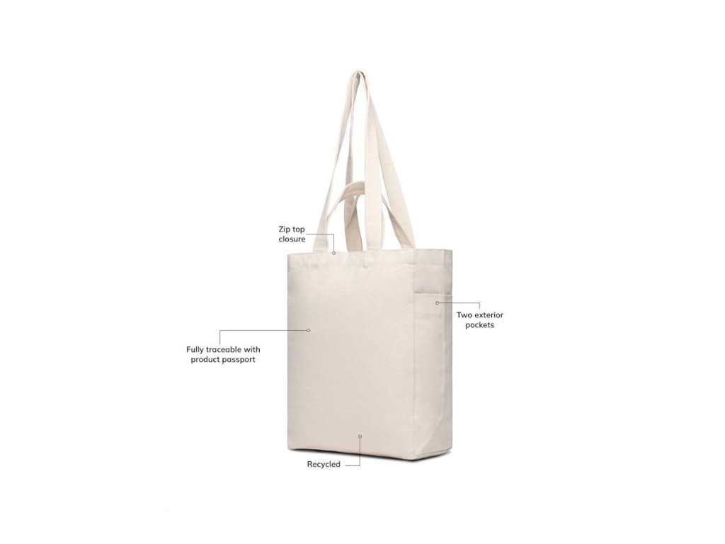 Kratšie uši na nosenie v ruke, dlhšie uši na nosenie na ramene. Dve otvorené vonkajšie vrecká. Vyrobené z recyklovaného nefarbeného plátna (canvas) bez použitia bielidiel a chemikálií. Zloženie: 70% recyklovaná bavlna, 30% recyklovaný polyester. AWARE™