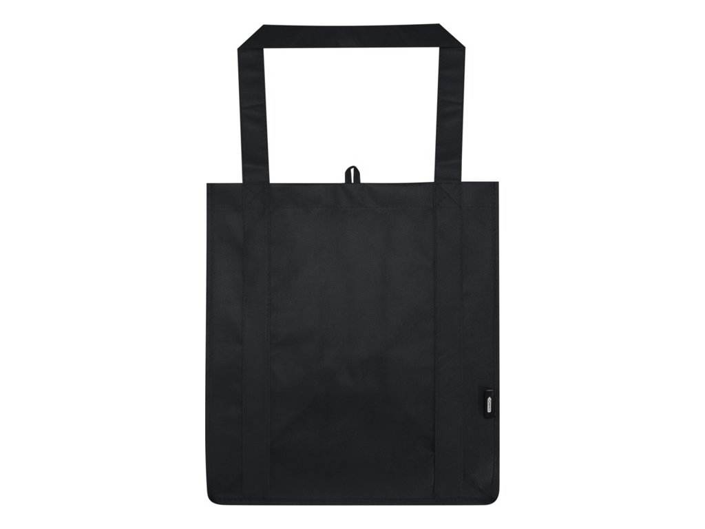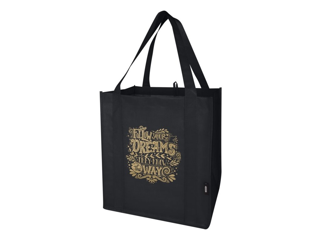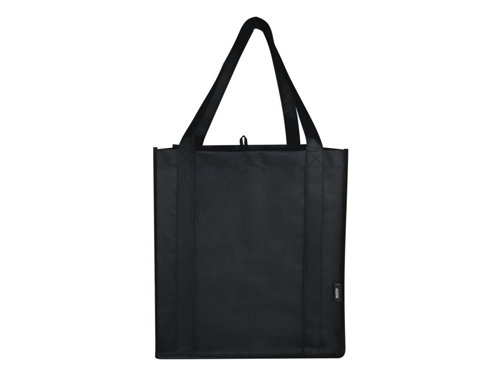Recyklovaná nákupná taška Liberty s certifikáciou GRS vyrobená z odolného netkaného RPET má podpornú spodnú dosku, vďaka ktorej je univerzálna a pevná. Nákupná taška má veľkú hlavnú priehradku a uši s dĺžkou 25 cm. Objem: 29 litrov. Nosnosť do 12 kg.