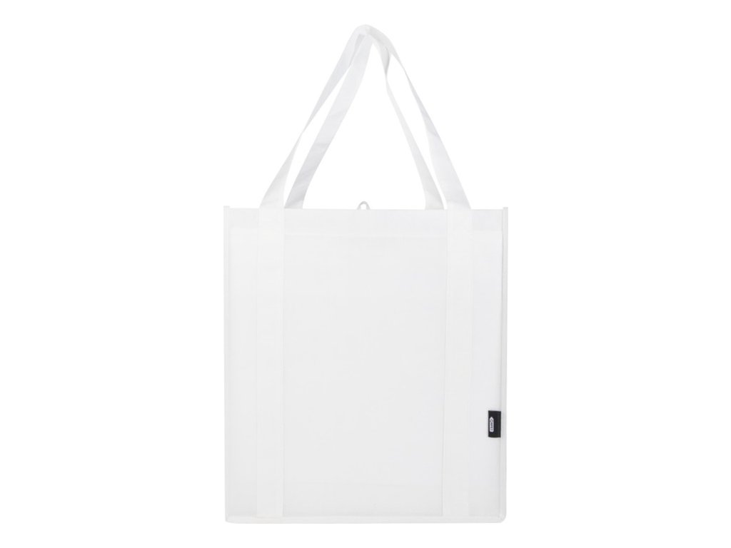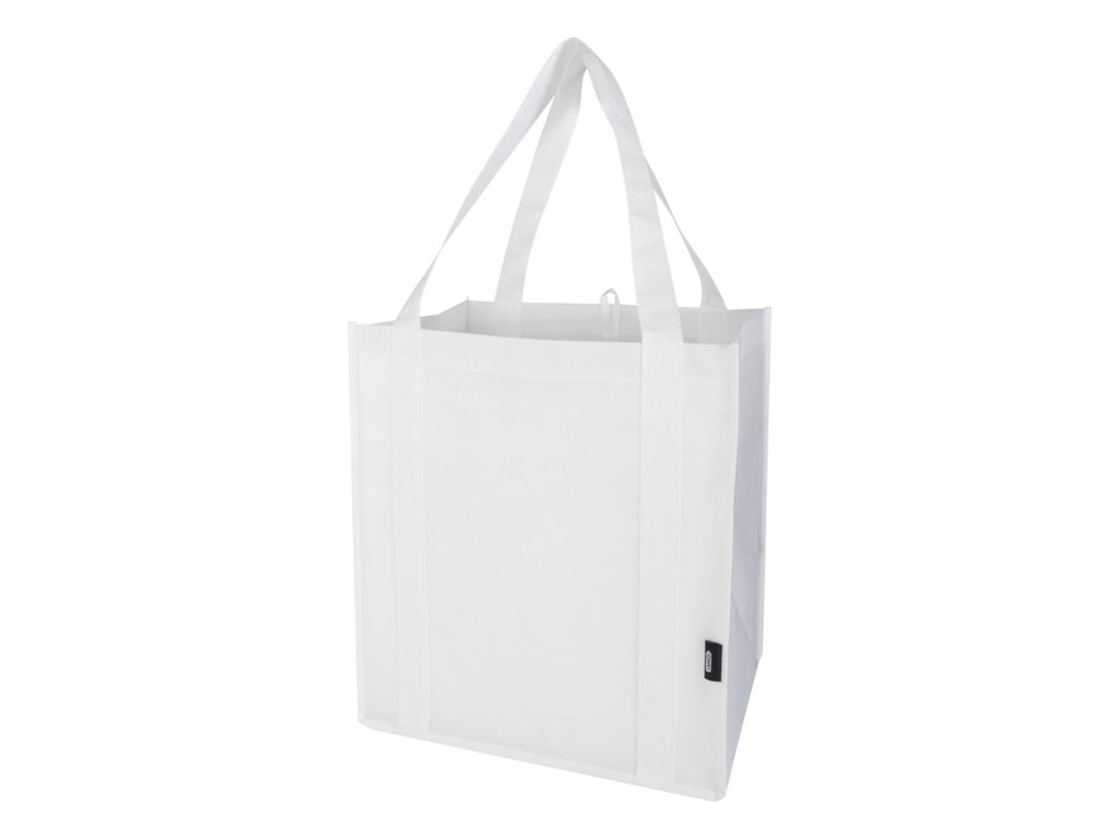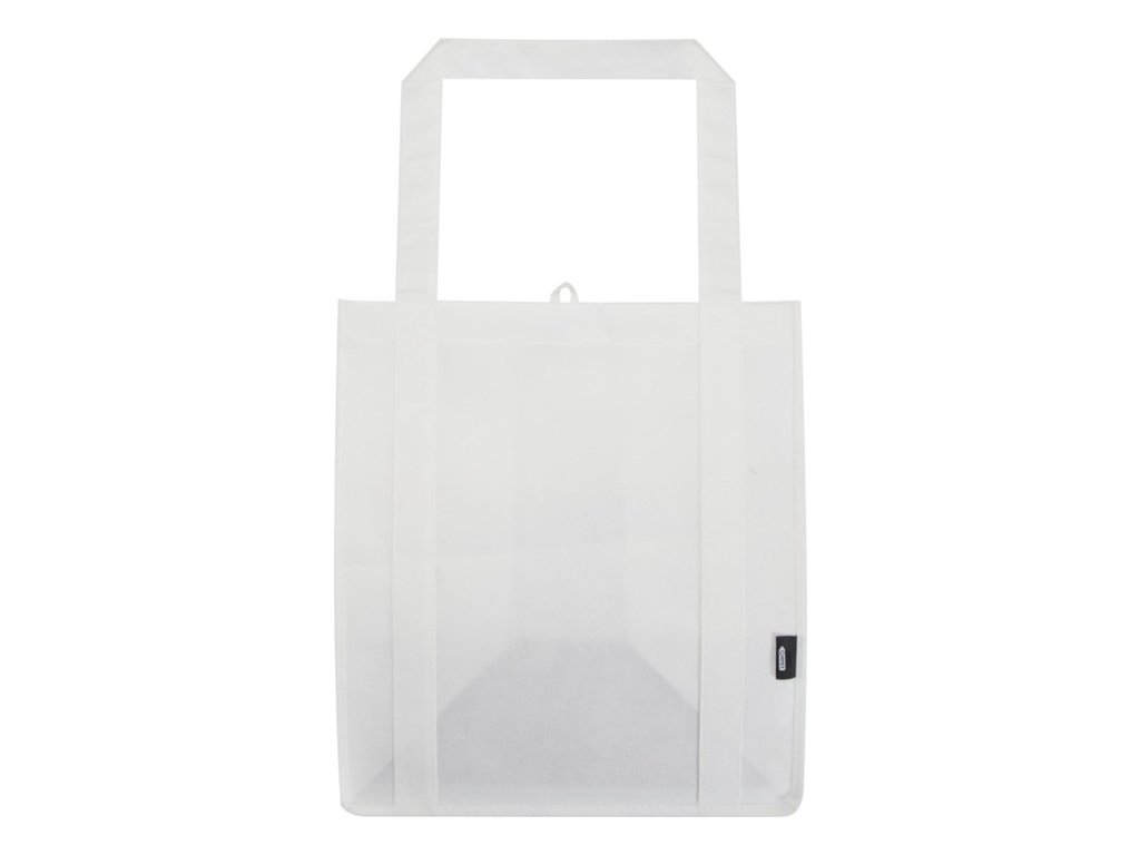 Recyklovaná nákupná taška Liberty s certifikáciou GRS vyrobená z odolného netkaného RPET má podpornú spodnú dosku, vďaka ktorej je univerzálna a pevná. Nákupná taška má veľkú hlavnú priehradku a uši s dĺžkou 25 cm. Objem: 29 litrov. Nosnosť do 12 kg.