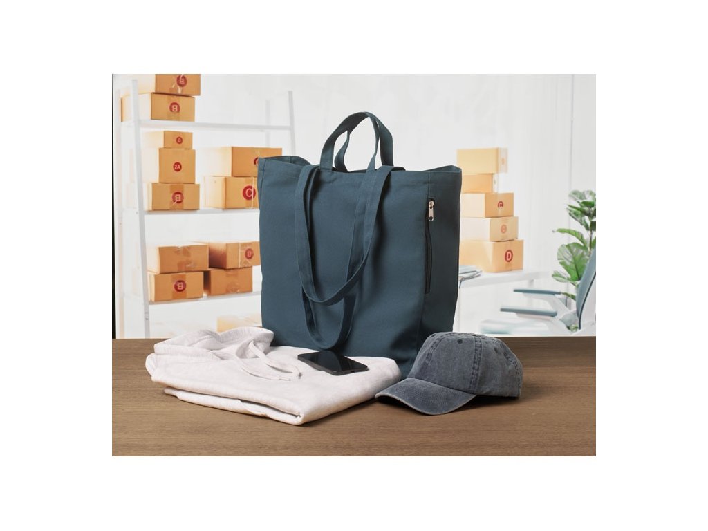 Nákupná alebo plážová taška z recyklovanej polybavlny (70 % recyklovaná bavlna, 30 % recyklovaný polyester) s krátkymi a dlhými rúčkami. Má bočné vrecko na zips. Gramáž 380 g/m2.