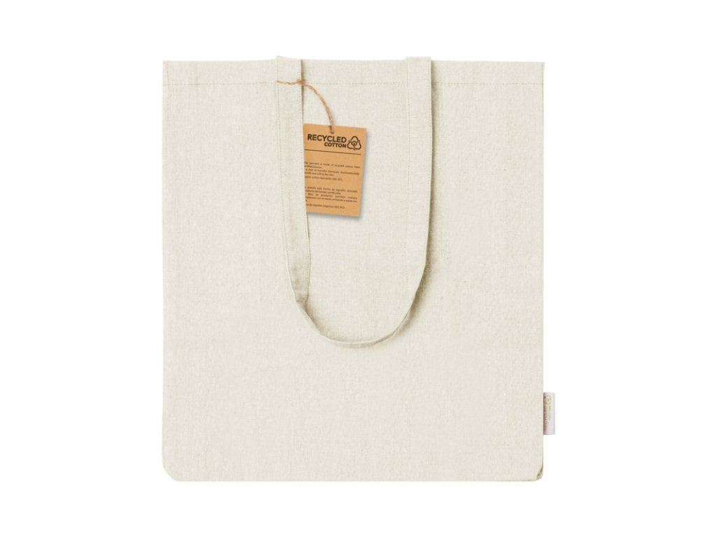 Nákupná taška z recyklovanej bavlny s klinom, dlhými ušami a výrazným štítkom z recyklovanej bavlny.