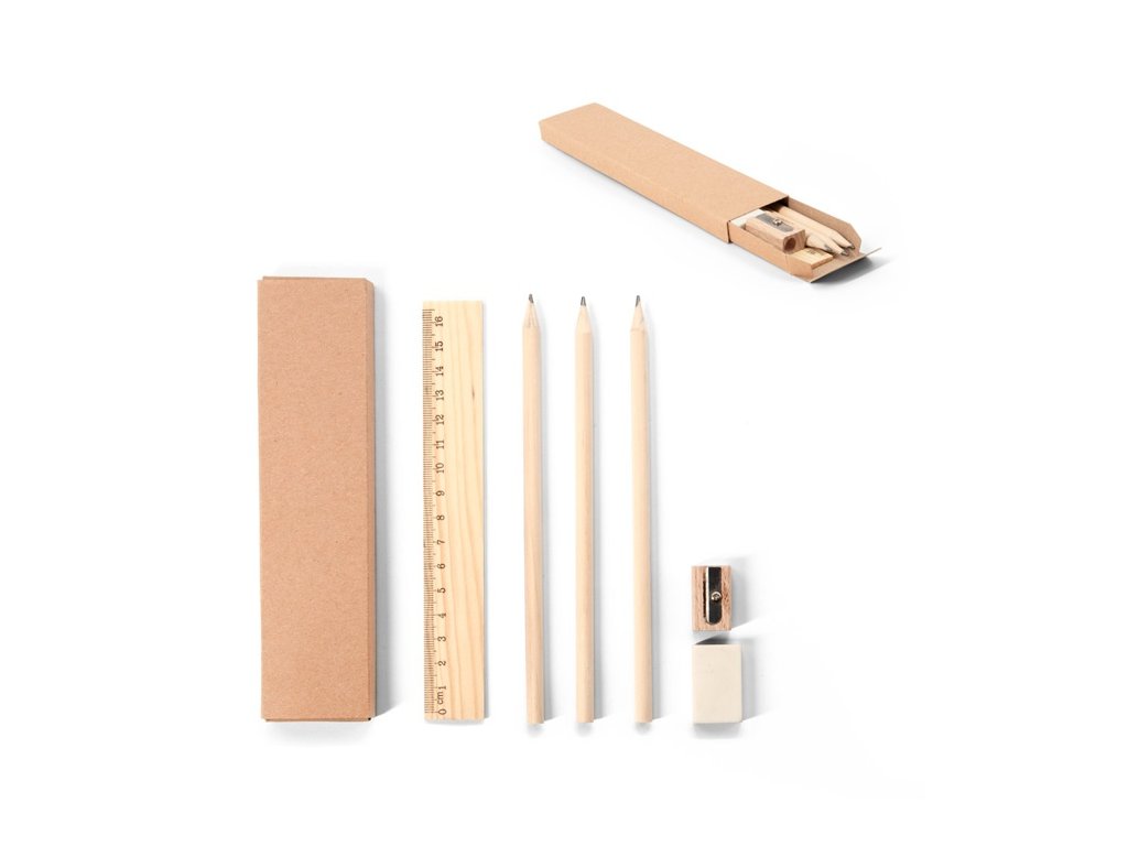 Univerzálna písacia sada pozostávajúca z 3 ceruziek s tvrdosťou HB, 1 dreveného strúhadla, 1 gumy z TPR a 1 pravítka z borovicového dreva (16,5 cm). Dodáva sa v darčekovej krabičke z kraftového papiera.
