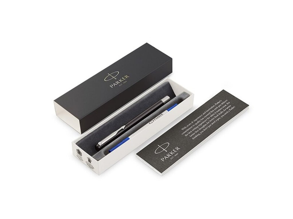 Telo a vrchnák z čierneho tvrdeného plastu, úchopová časť a doplnky z nerez ocele. Štandardná náplň Quink pre rollery - modrá.