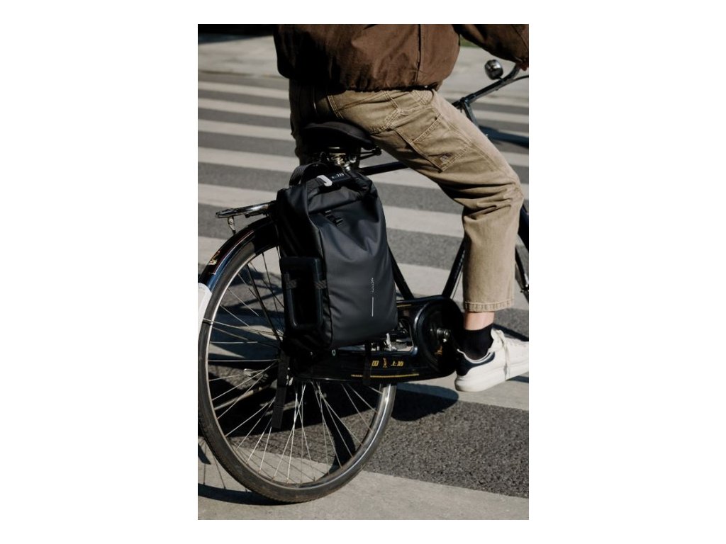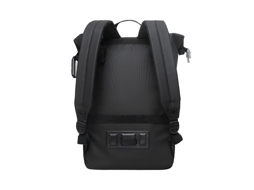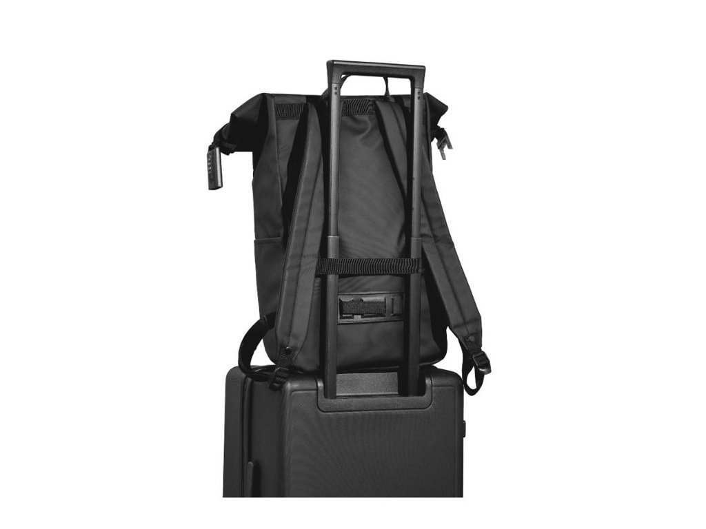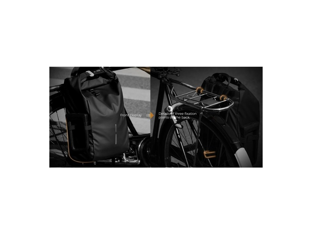 Hlavnú priehradku je možné zrolovať a zaistiť kombinačným zámkom, možnosť uzamknúť k pevnému predmetu alebo pripevniť k rámu kolesa. Polstrované vrecko na 16" laptop a sieťované vrecká na drobnosti. Vonkajšia časť z vodeodolného PU. Registrovaný design