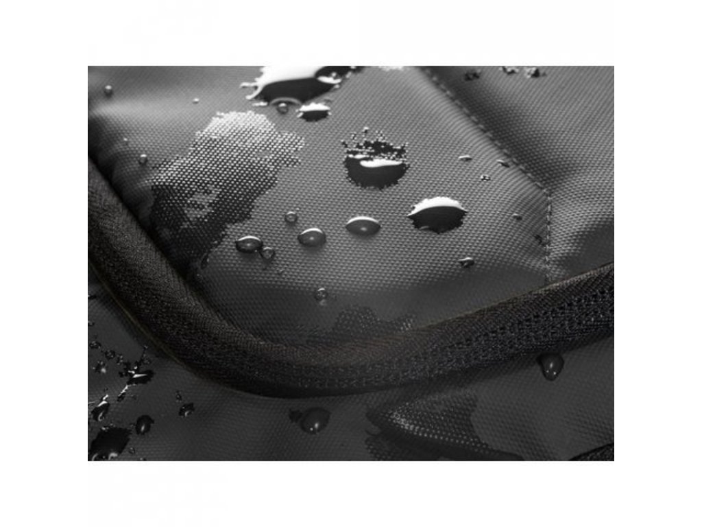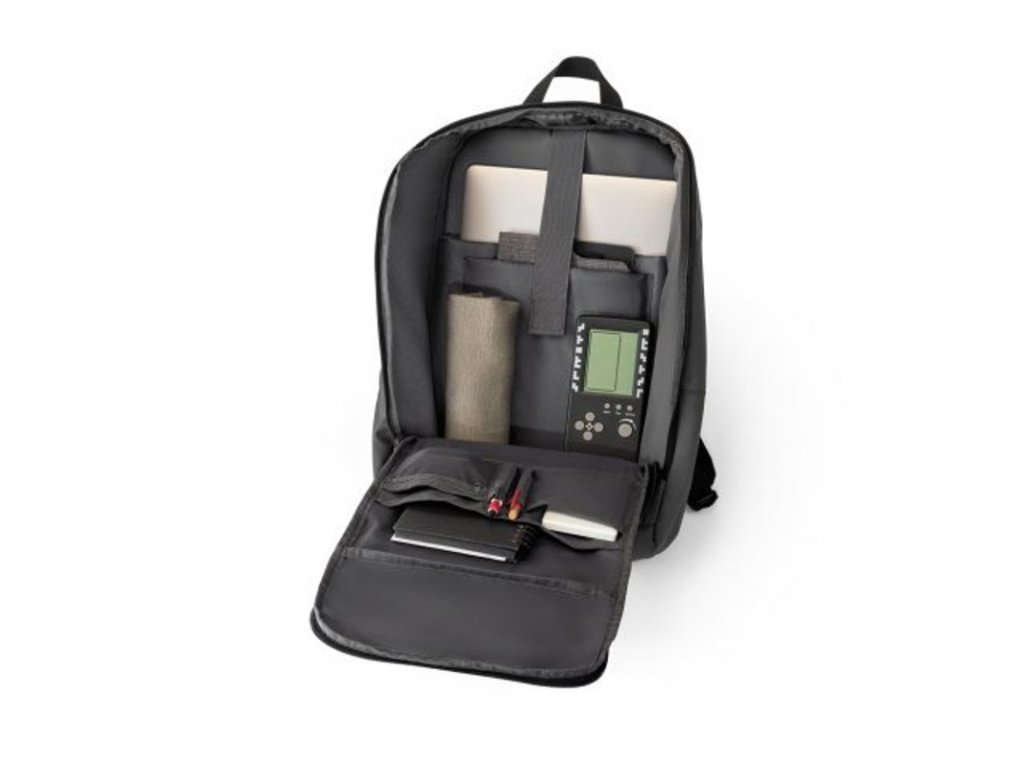 Hlavná časť s 2 polstrovanými prepážkami pre notebooky 16" a tablet do 10,1". Predné vrecko na zips s vnútornými prepážkami. Bočné vrecko na fľašu. Zadná časť má extra polstrovanie a obsahuje popruh na vozík. Reflexný pásik na prednej strane. Objem 19 l.