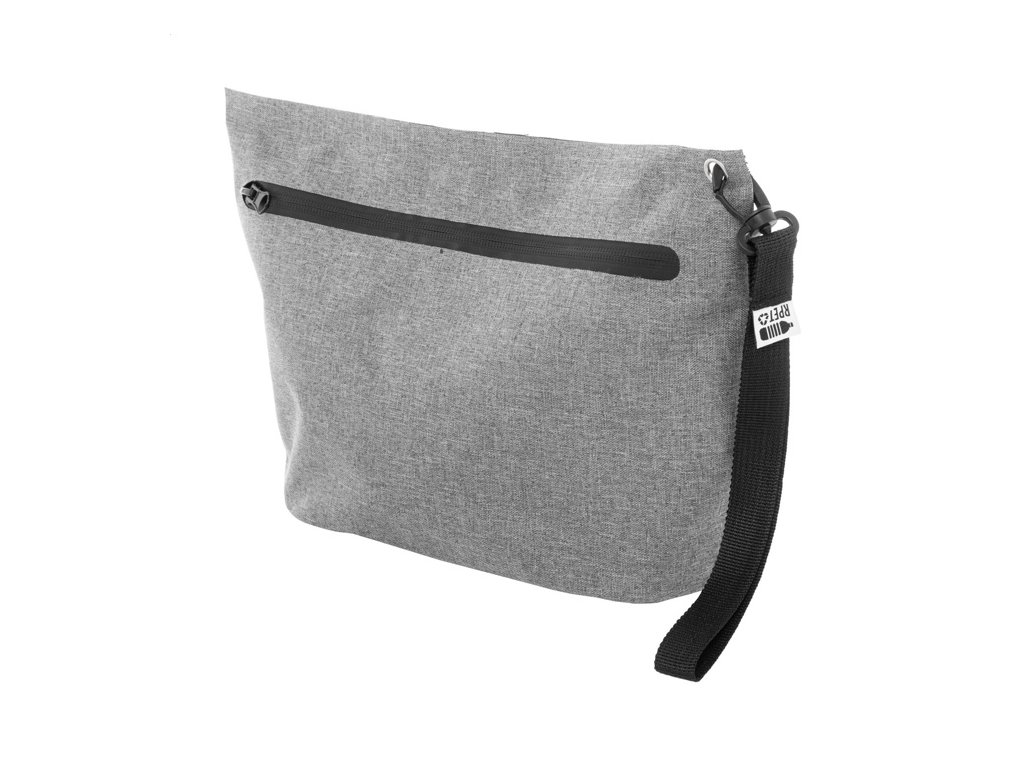 Vodotesná kozmetická taštička na zips z 300D RPET polyesteru s karabínou na zápästí. S výrazným štítkom RPET.