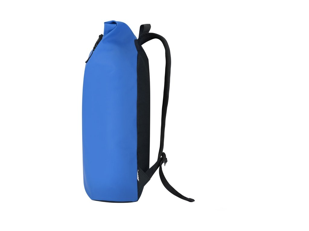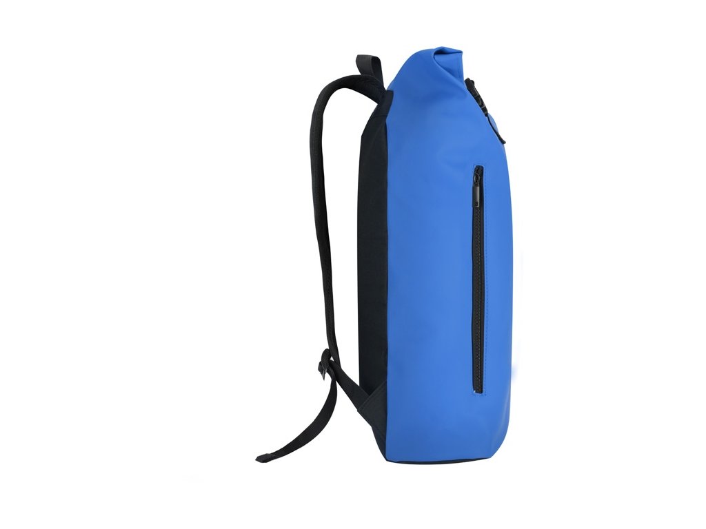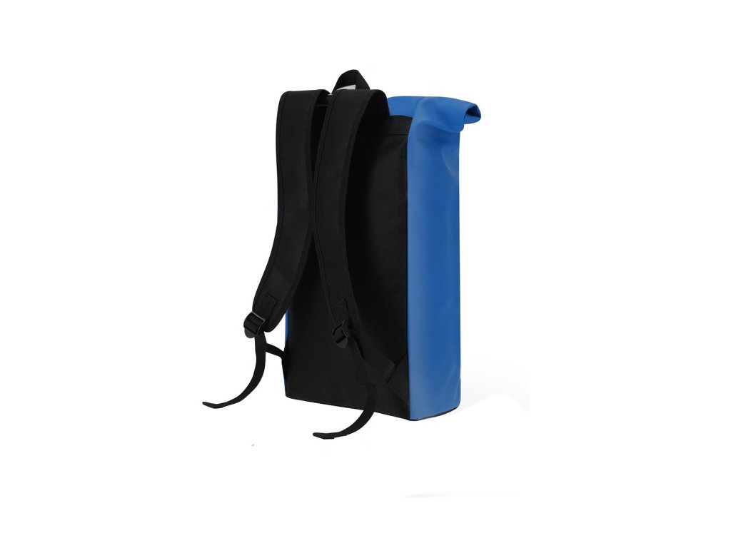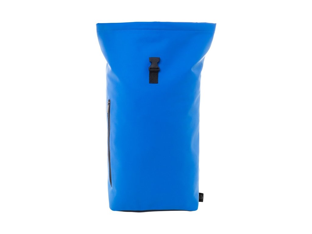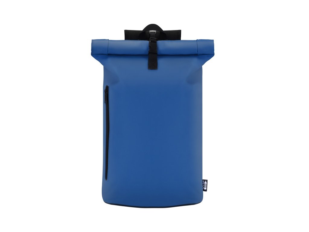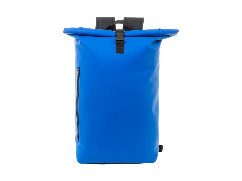Vodotesný, mäkký rolovací batoh z recyklovanej PU kože so zapínaním na pracku, predným vreckom na zips a polstrovanou priehradkou na notebook (15"). S polstrovaným chrbtom a ramennými popruhmi. S výrazným recyklovaným PU štítkom.