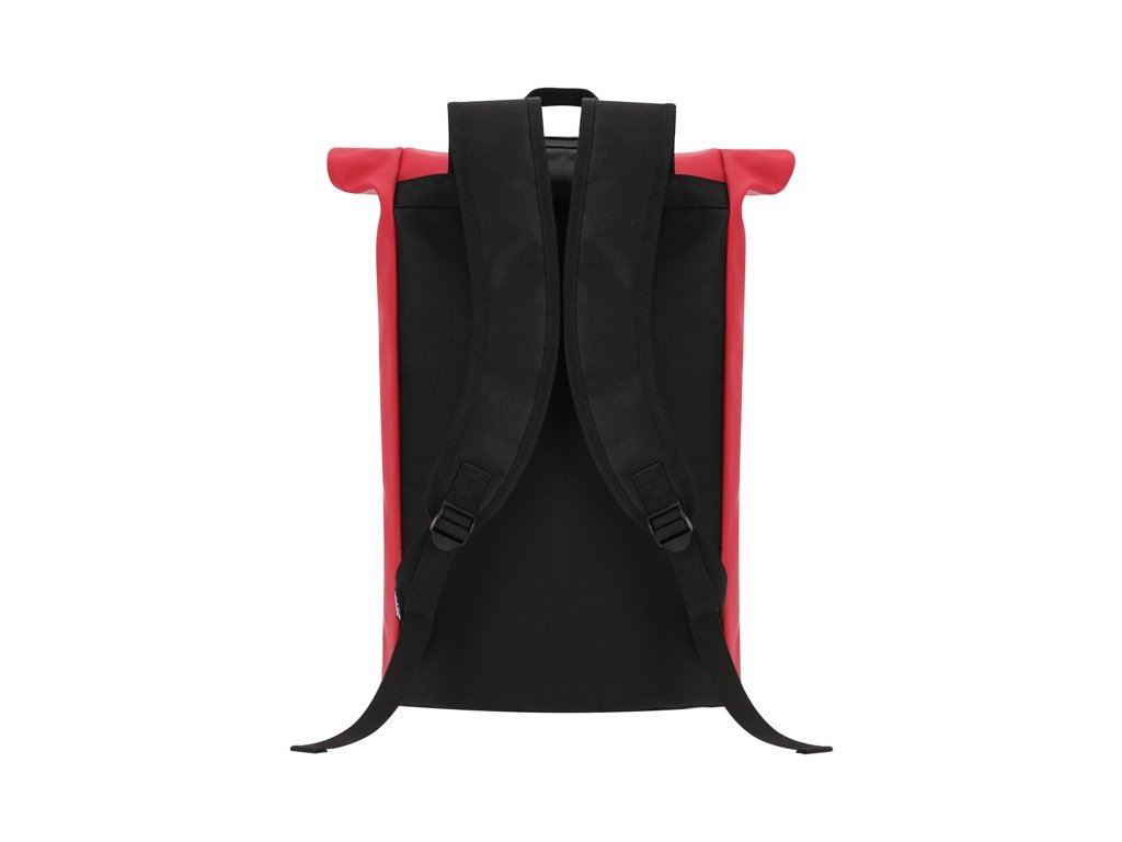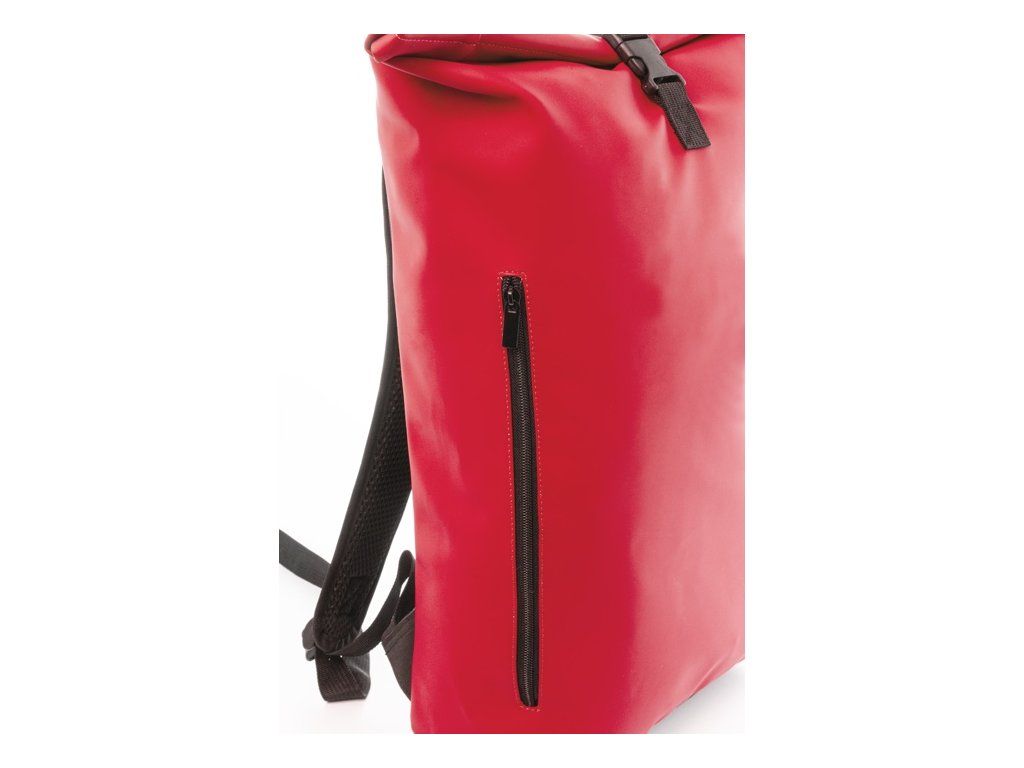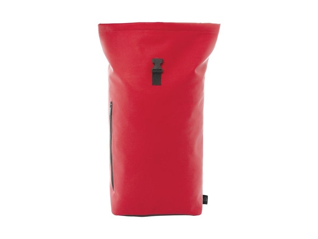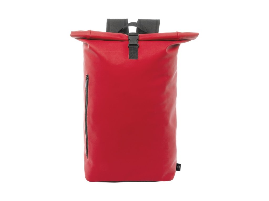 Vodotesný, mäkký rolovací batoh z recyklovanej PU kože so zapínaním na pracku, predným vreckom na zips a polstrovanou priehradkou na notebook (15"). S polstrovaným chrbtom a ramennými popruhmi. S výrazným recyklovaným PU štítkom.