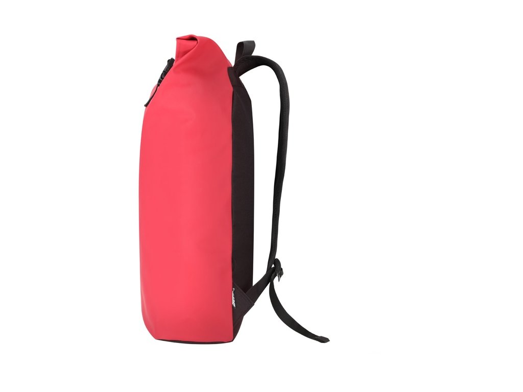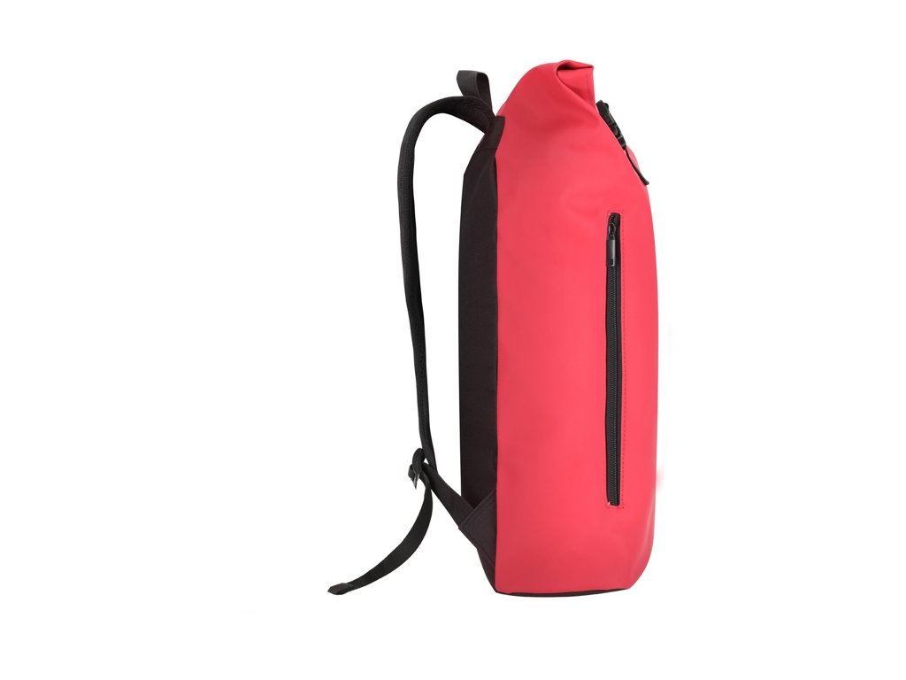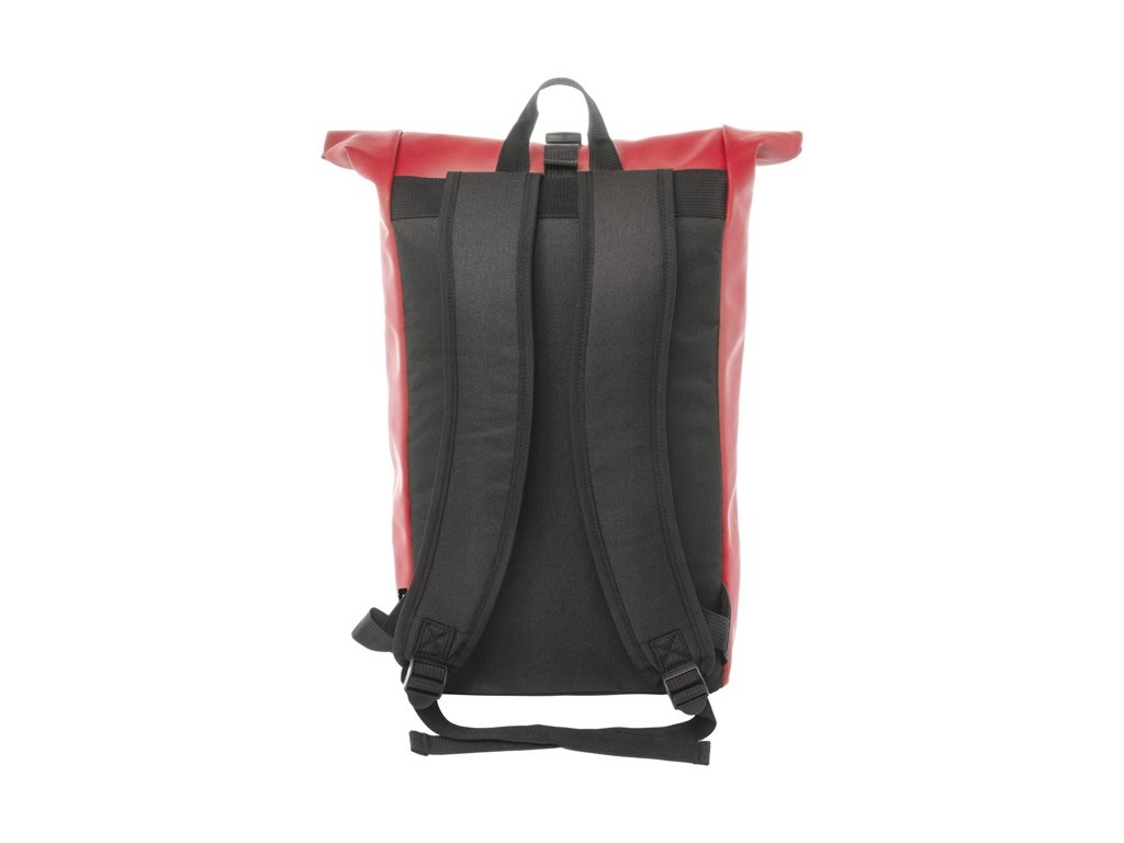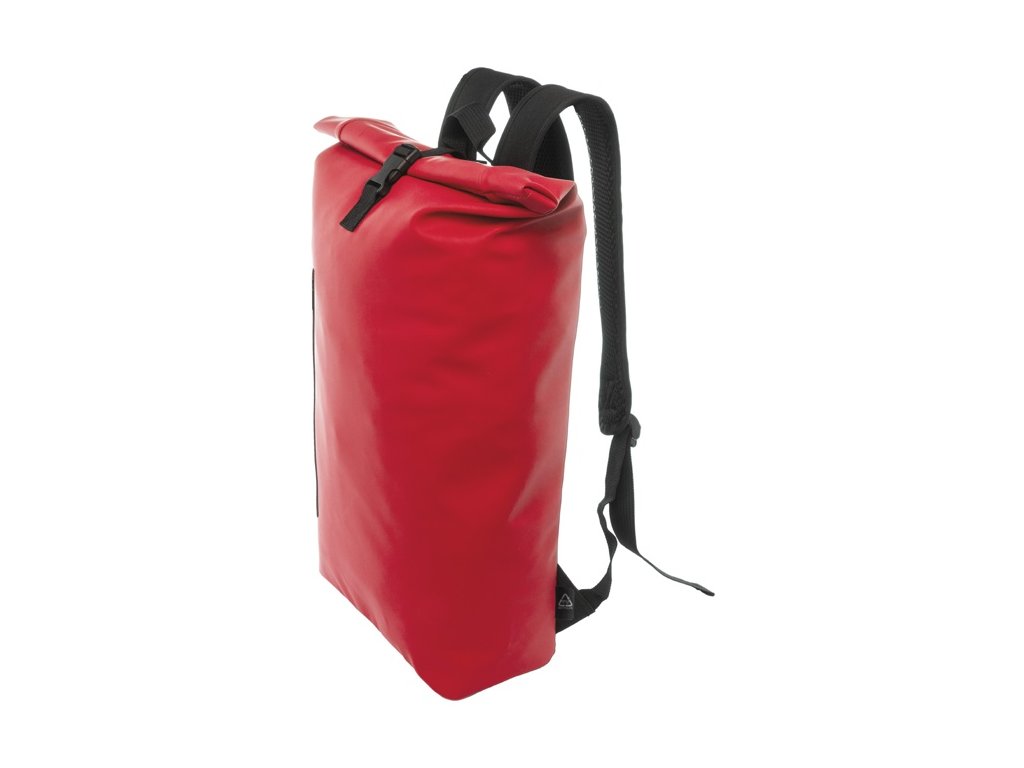 Vodotesný, mäkký rolovací batoh z recyklovanej PU kože so zapínaním na pracku, predným vreckom na zips a polstrovanou priehradkou na notebook (15"). S polstrovaným chrbtom a ramennými popruhmi. S výrazným recyklovaným PU štítkom.