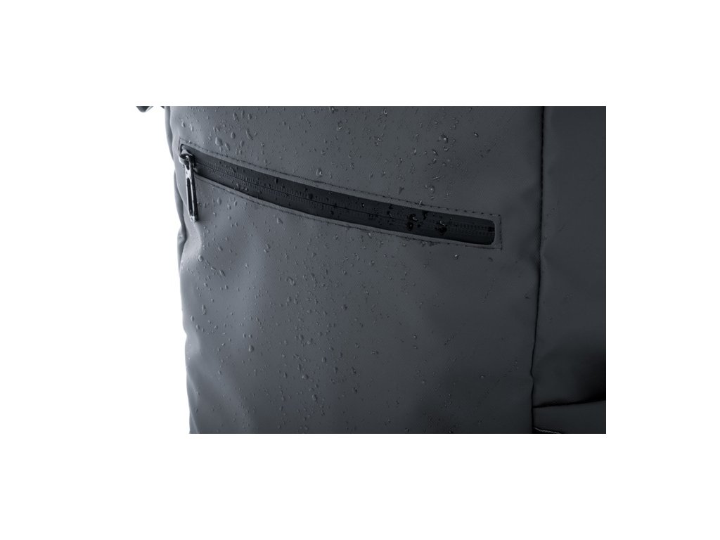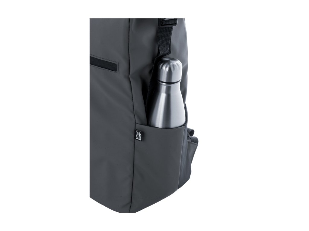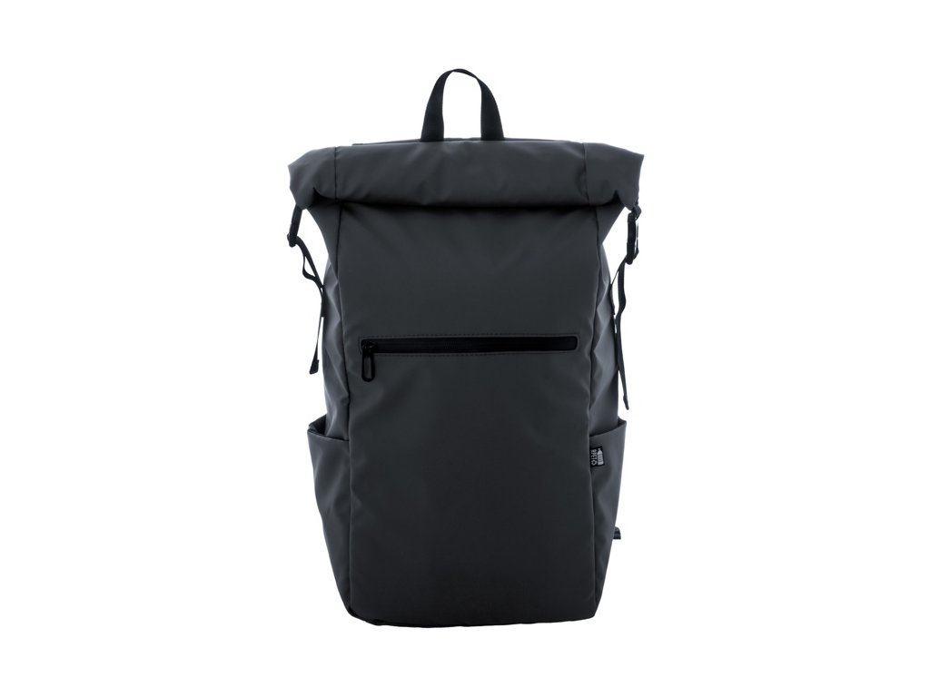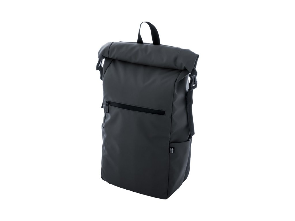 Vodotesný rolovací batoh z RPET so zapínaním na pracku a suchý zips, polstrovaná priehradka na notebook (16") a tablet (10"), predné vrecko na zips, bočné vrecká, polstrovaný chrbát a ramenné popruhy. Polyester 600D RPET potiahnutý PU, s výrazným štítkom