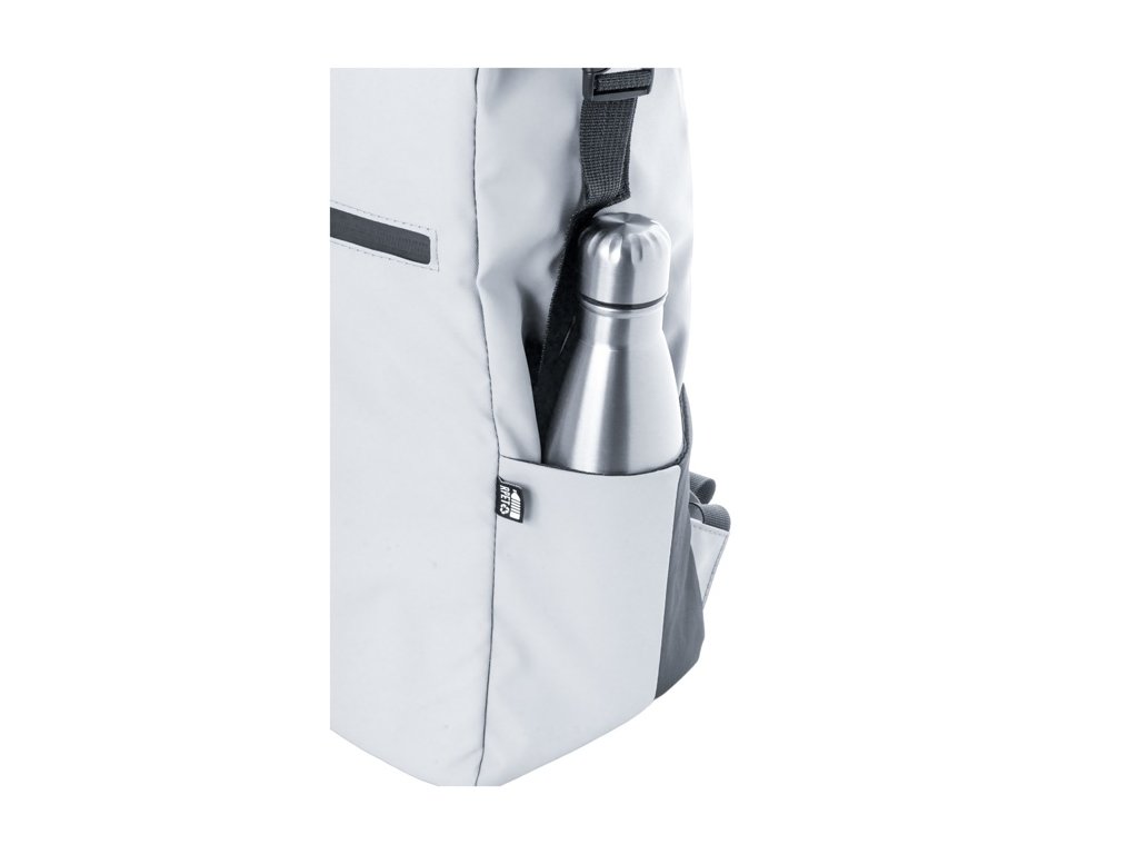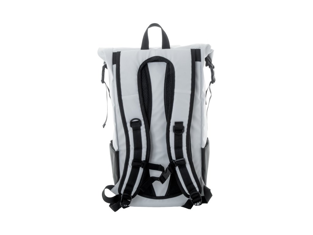 Vodotesný rolovací batoh z RPET so zapínaním na pracku a suchý zips, polstrovaná priehradka na notebook (16") a tablet (10"), predné vrecko na zips, bočné vrecká, polstrovaný chrbát a ramenné popruhy. Polyester 600D RPET potiahnutý PU, s výrazným štítkom