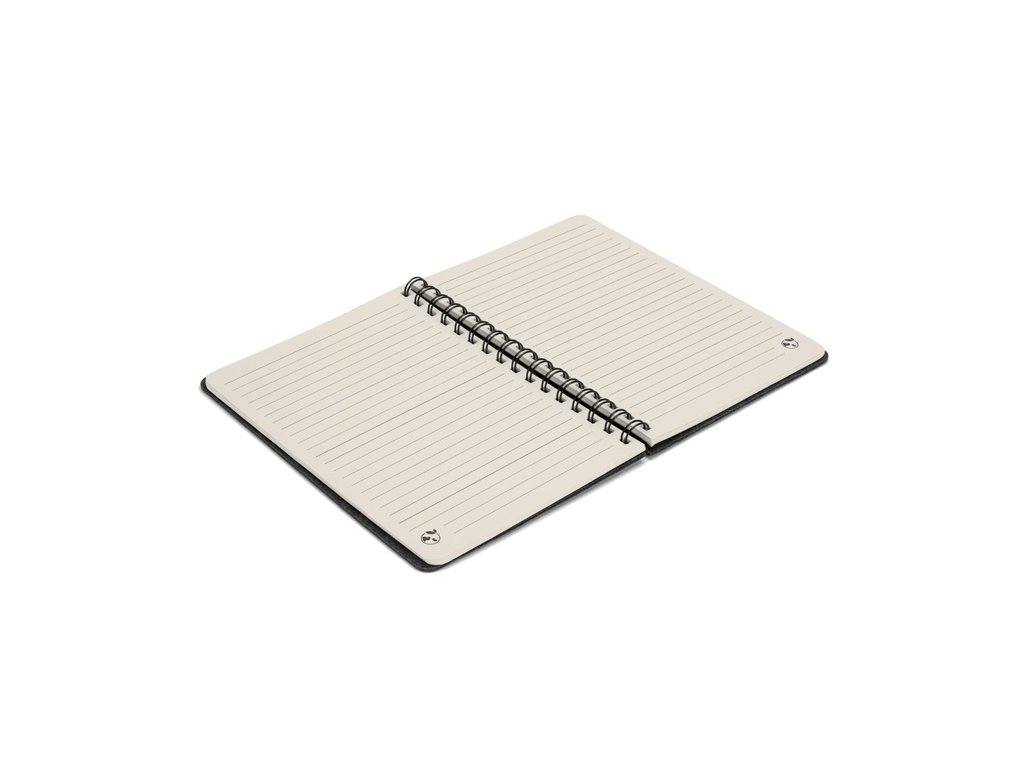 Zápisník A5 s polopevným obalom z recyklovanej plsti s krúžkovou väzbou. Obsahuje 160 linajkových strán (70 g/m2) na 100% recyklovanom papieri farby slonovej kosti.