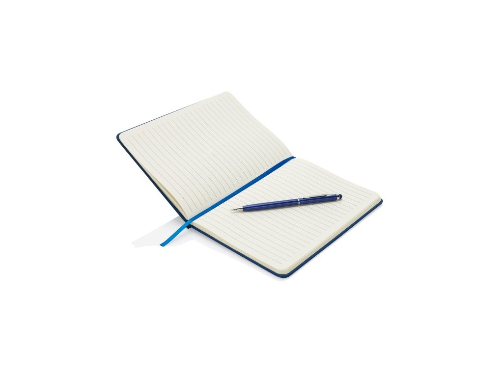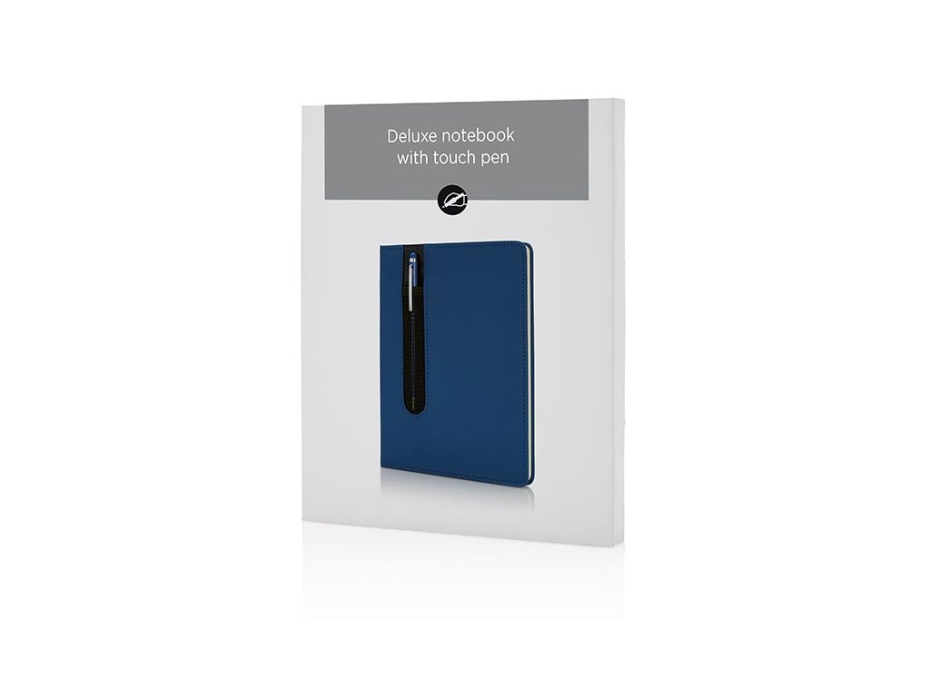 Zápisník A5 s polyuretánovými doskami, puzdrom na pero a kovovým perom s dotykovým hrotom. Dodaný v darčekovom balení. Zápisník obsahuje 160 listov z papiera s gramážou 80g/m2.