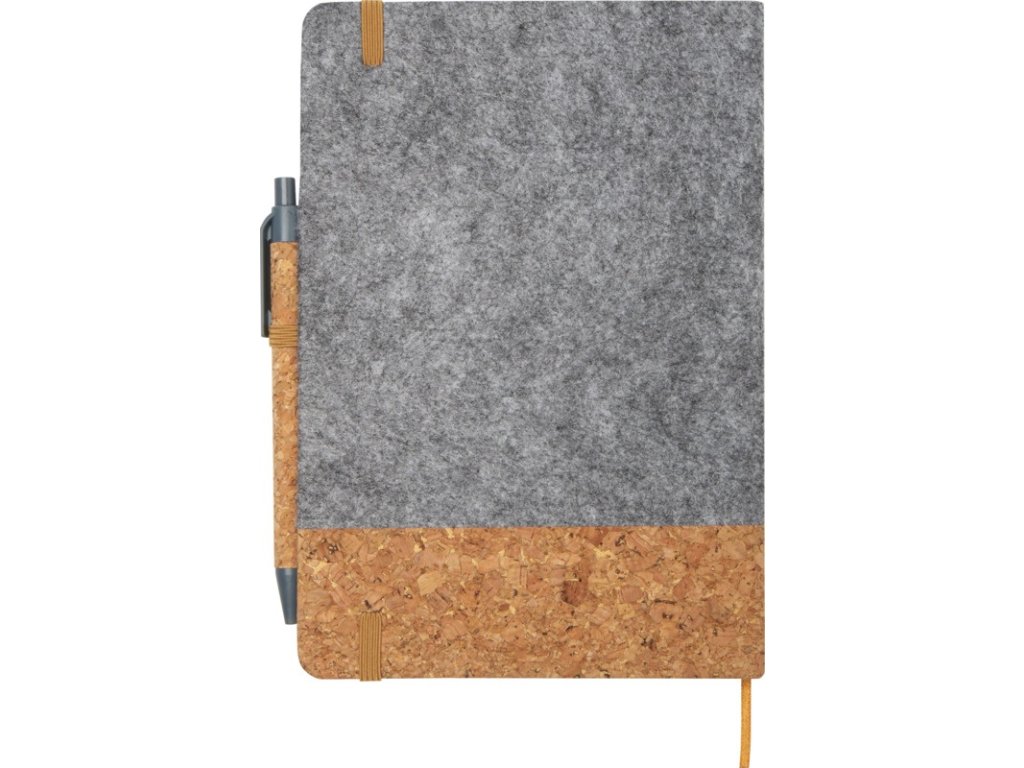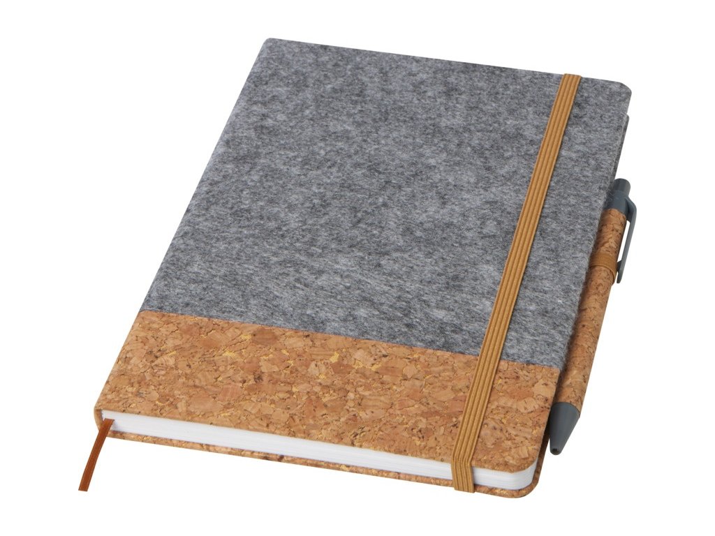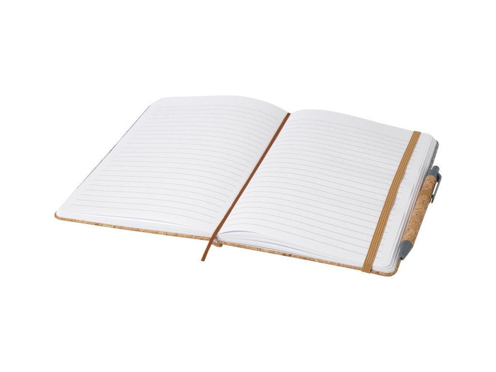 Zápisník A5 s pevnou väzbou z korku a recyklovanej plsti, 80 linkovaných listov 70 g/m?, elastické zatváranie, záložka a pútko na pero. Čierna náplň. Dĺžka písania: 600 metrov. Hrot: 1,0 mm.