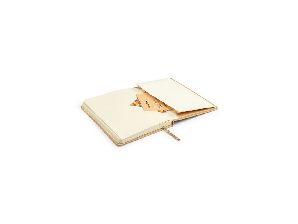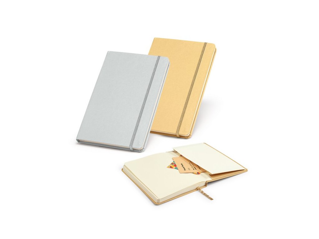 Zápisník A5 so 160 stranami bez linajok v slonovinovej farbe, vnútorným vreckom a tvrdými kovovými doskami (zlatá alebo strieborná farba).