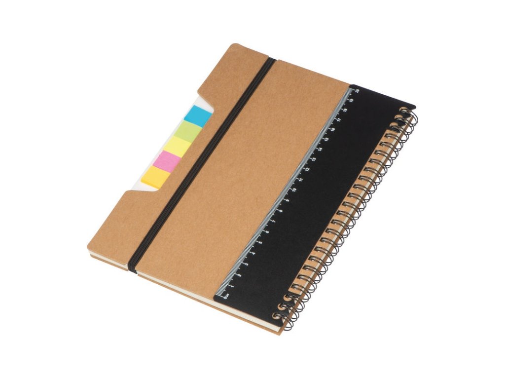 Špirálový zápisník so samolepiacimi poznámkovými pásikmi, pravítkom a gumičkou na uzatvorenie. Obsahuje 120 bodkovaných strán.