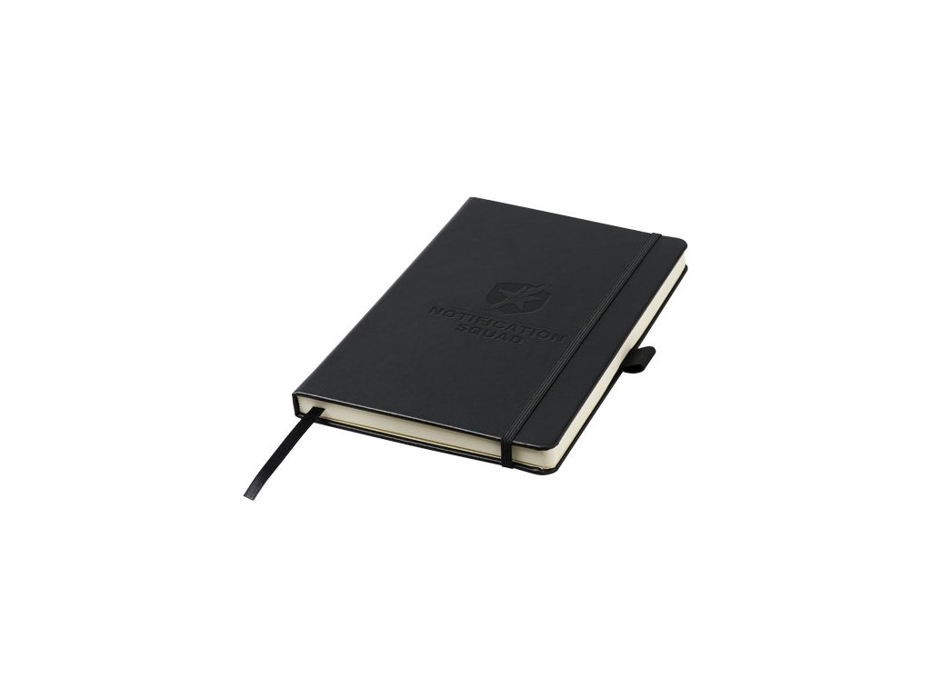 Zápisník A5 s imitáciou kože A5 (14,2 cm x 21,4 cm) (koženka) s elastickou gumičkou, záložkou, pútkom na pero a skladacím zadným vreckom.