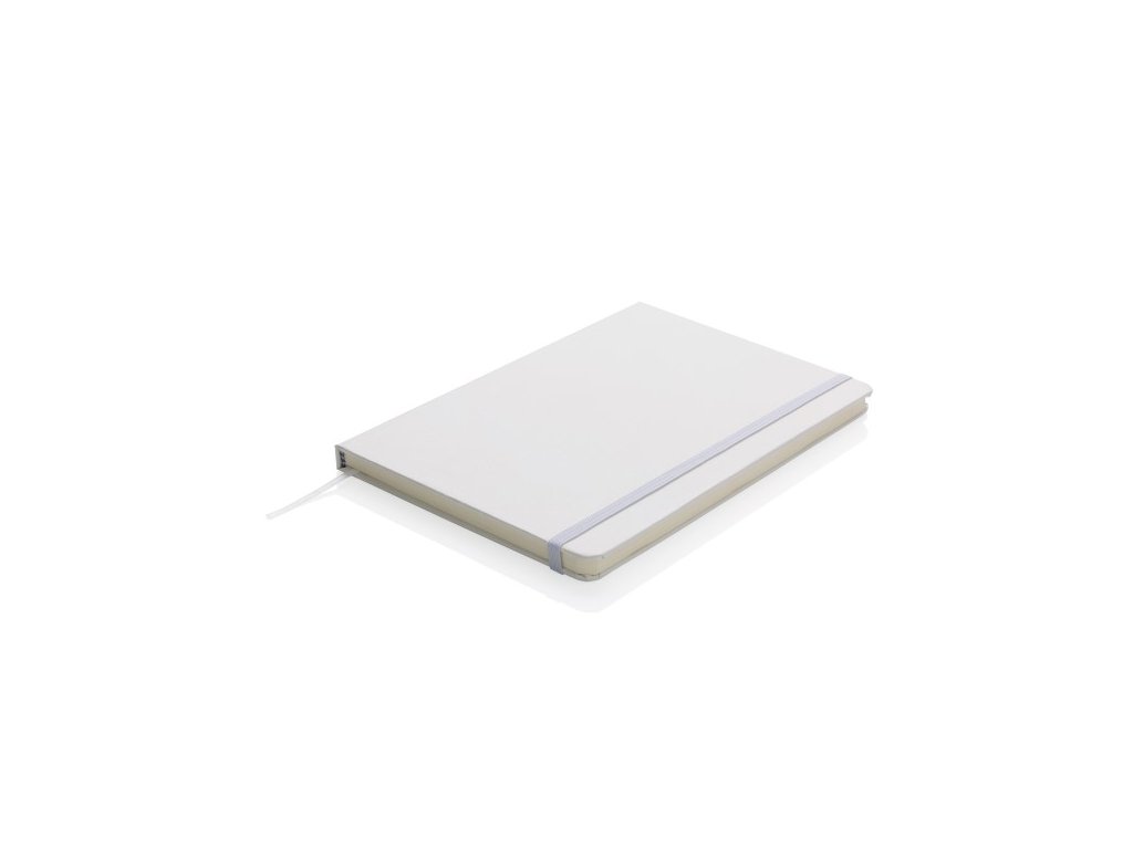 Čistý zápisník A5 s tvrdým obalom, elastickou gumičkou a záložkou zo stužky. 144 strán 70g/m2. Krémovo sfarbené strany.