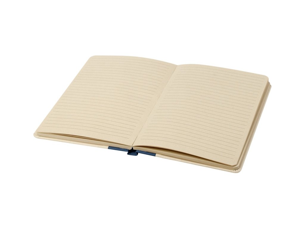 Zápisník s pevnou väzbou A5 so zaoblenými rohmi a 80 linajkovými listami s gramážou papiera 90 g/m?. Obálka je vyrobená z materiálu RPET a plastu z cukrovej trstiny.