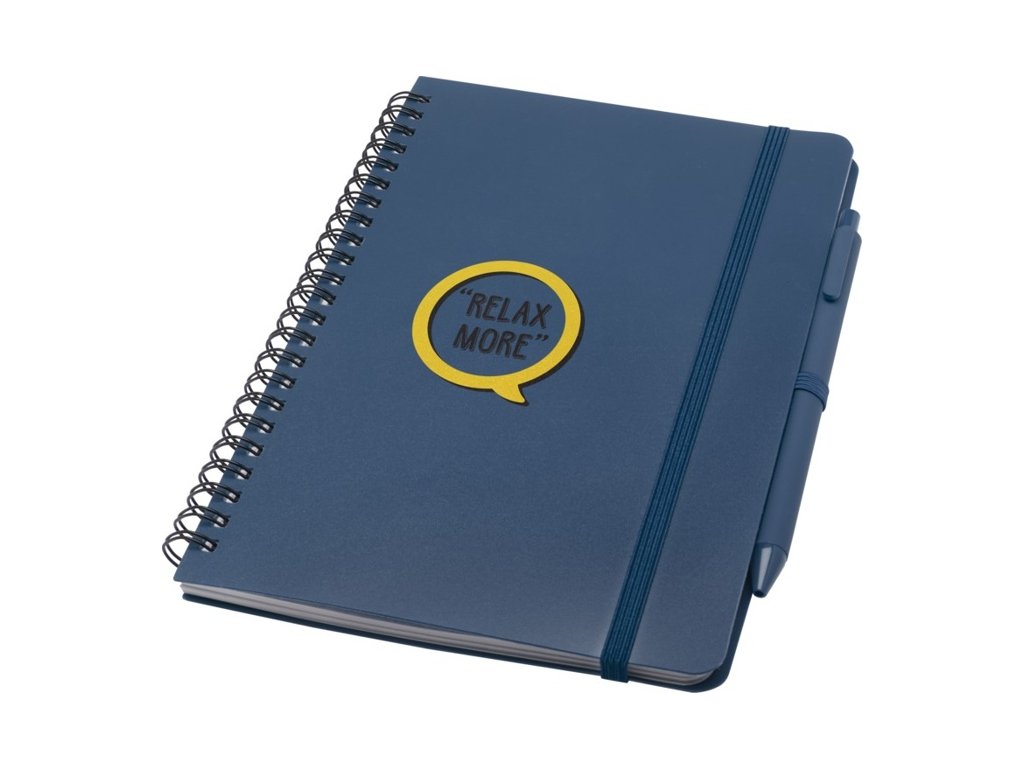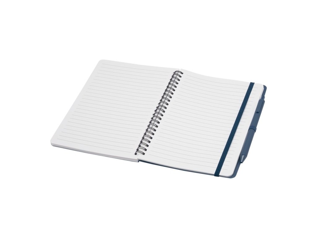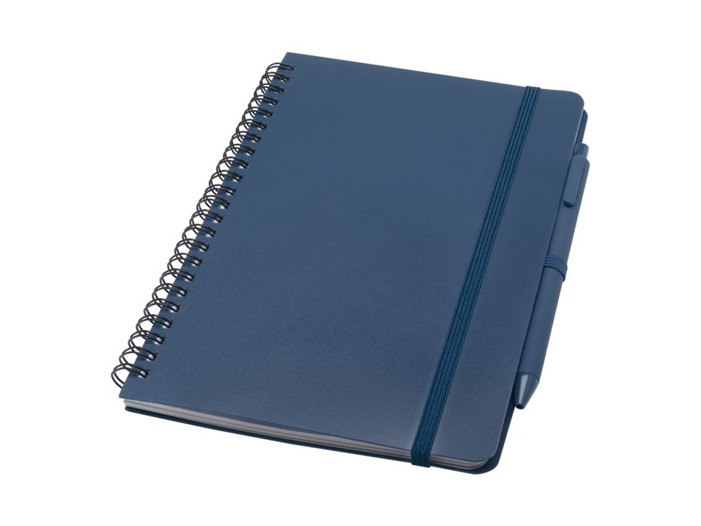Zápisník A5 s pevnou obálkou z recyklovaného plastu, ktorý by inak skončil v oceáne, s 80 linajkovými listami papiera 70 g/m2 v krémovej farbe. Zaoblené rohy, elastické zatváranie a pútko na pero. Pero s čiernou náplňou. Dĺžka písania: 1000 m. Hrot: 1,0 mm.