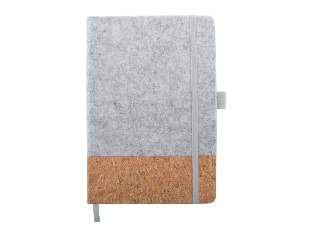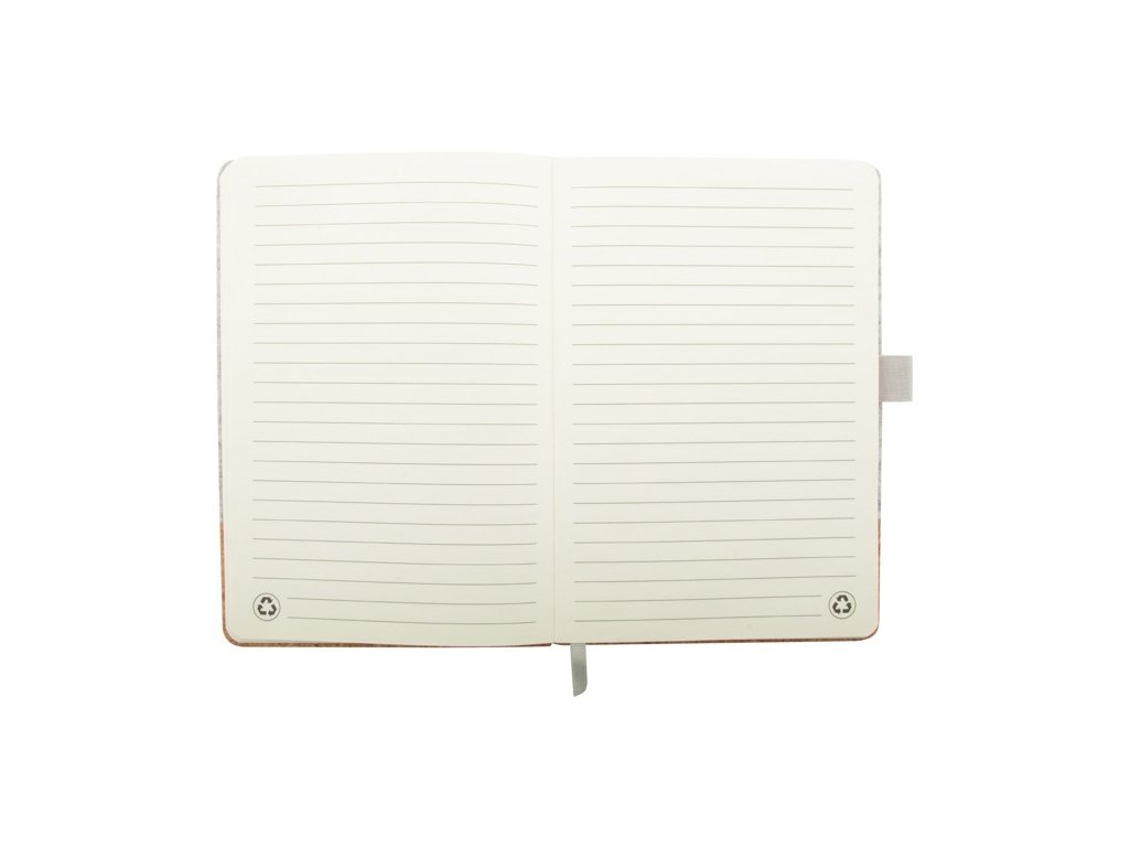 Blok A5 z RPET plsti a prírodného korku s 80 linajkovými listami z recyklovaného papiera. So záložkou, gumovým pásikom a držiakom na pero.